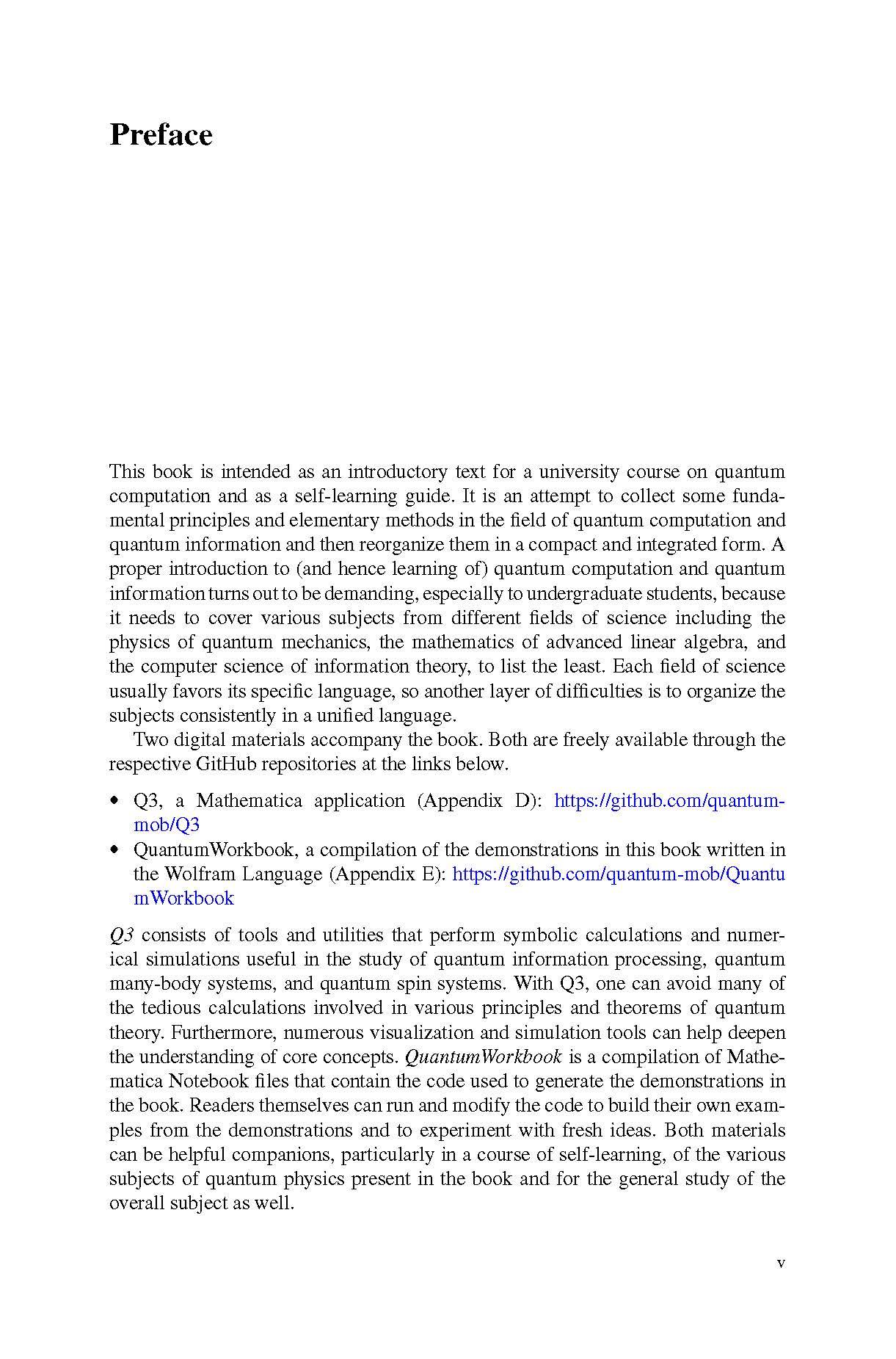 In this book, we have organized all the subjects required to understand the principles of quantum computation and information processing in a manner suited to physics, mathematics, and engineering courses as early as undergraduate studies.In addition, we provide a supporting package of quantum simulation software from Wolfram Mathematica, specialists in symbolic calculation software.
