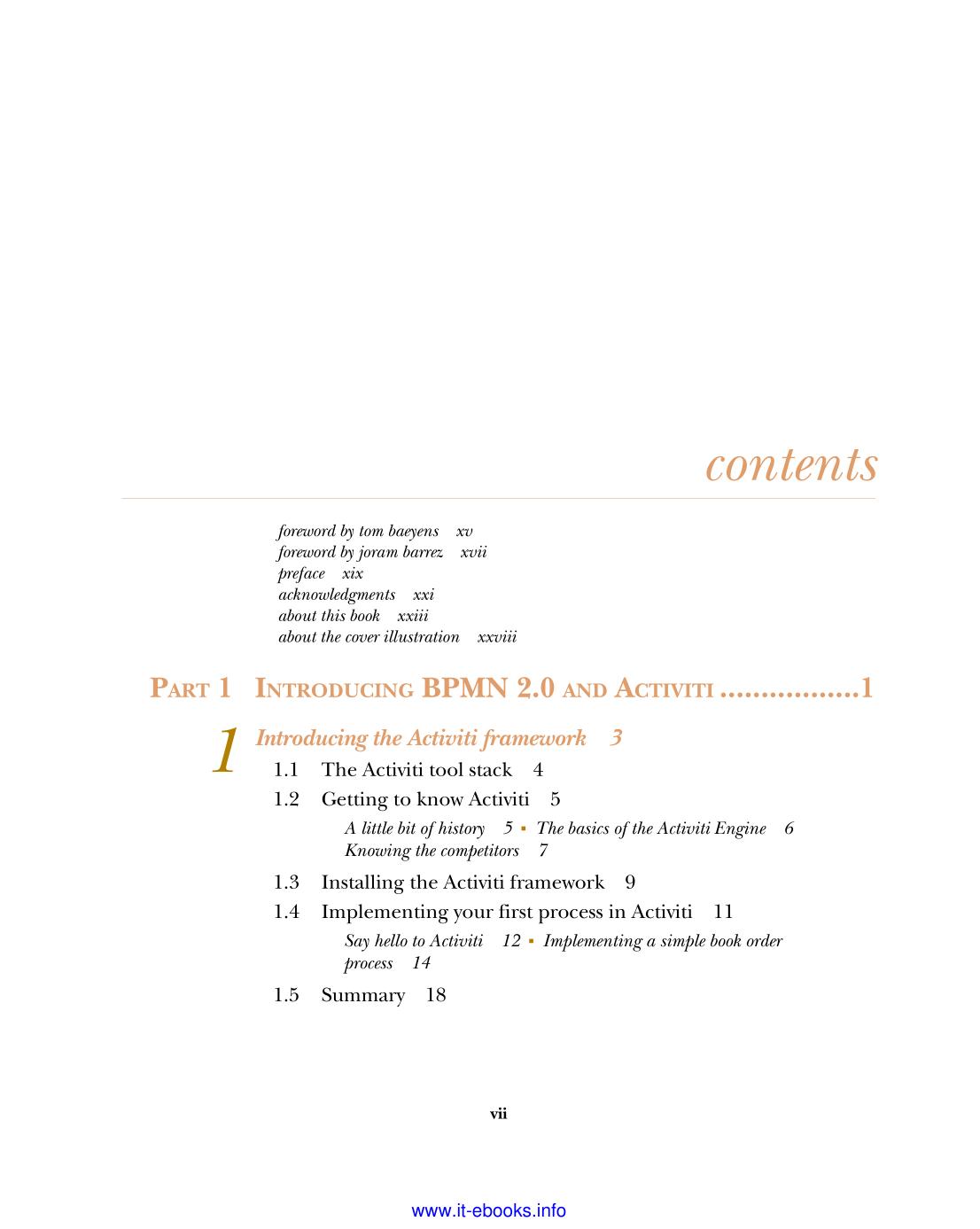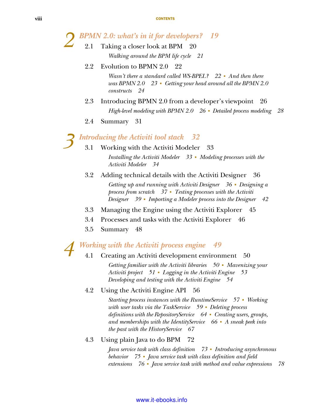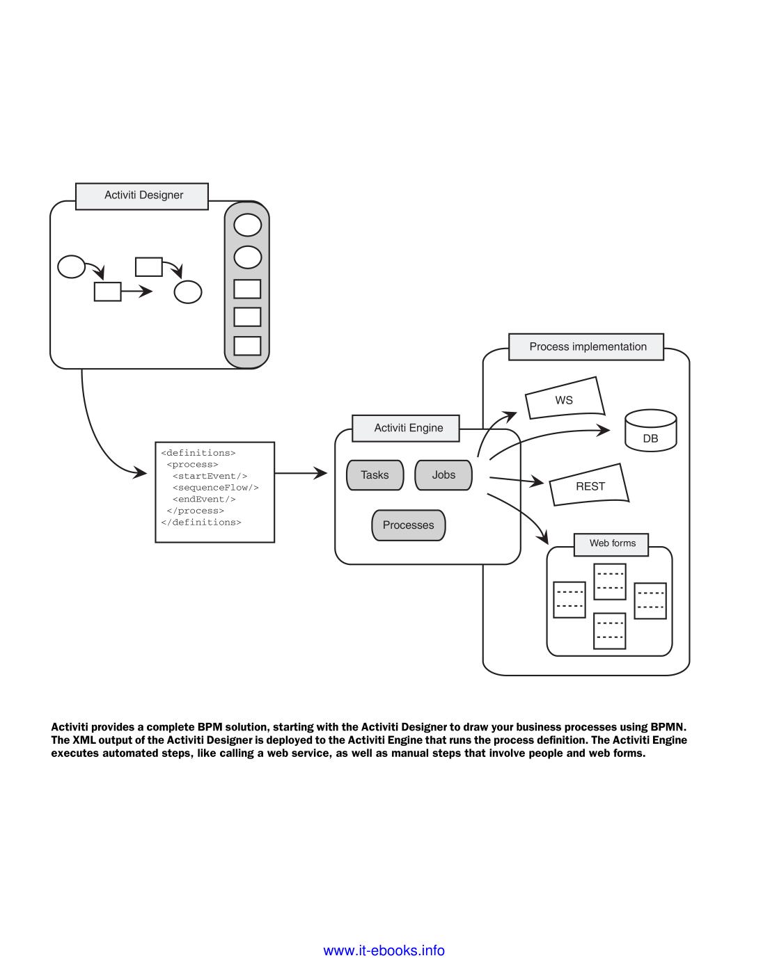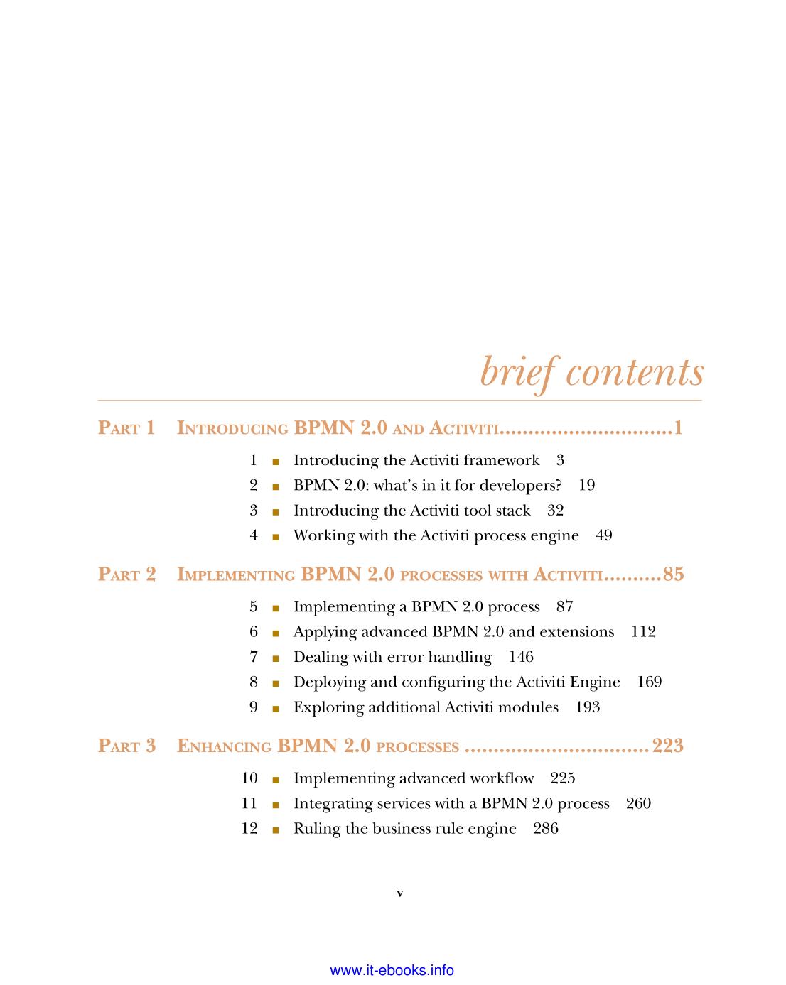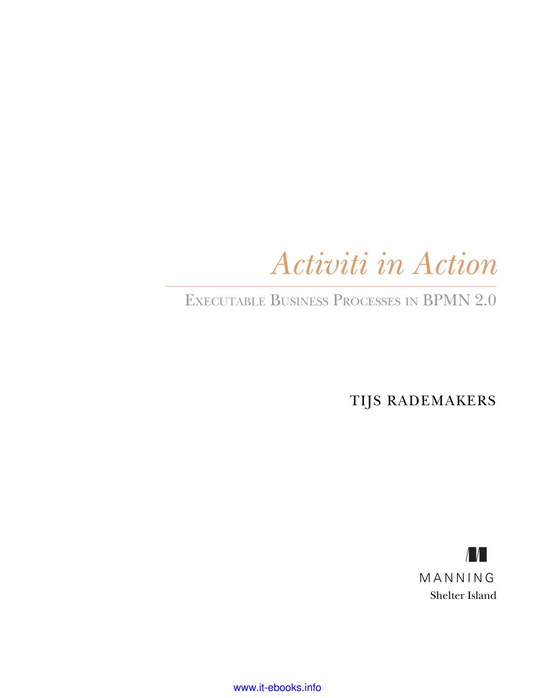 Activiti in Action is a comprehensive tutorial designed to introduce developers to the world of business process modeling using Activiti. Before diving into the nuts and bolts of Activiti, this book presents a solid introduction to BPMN 2.0 from a developer's perspective.