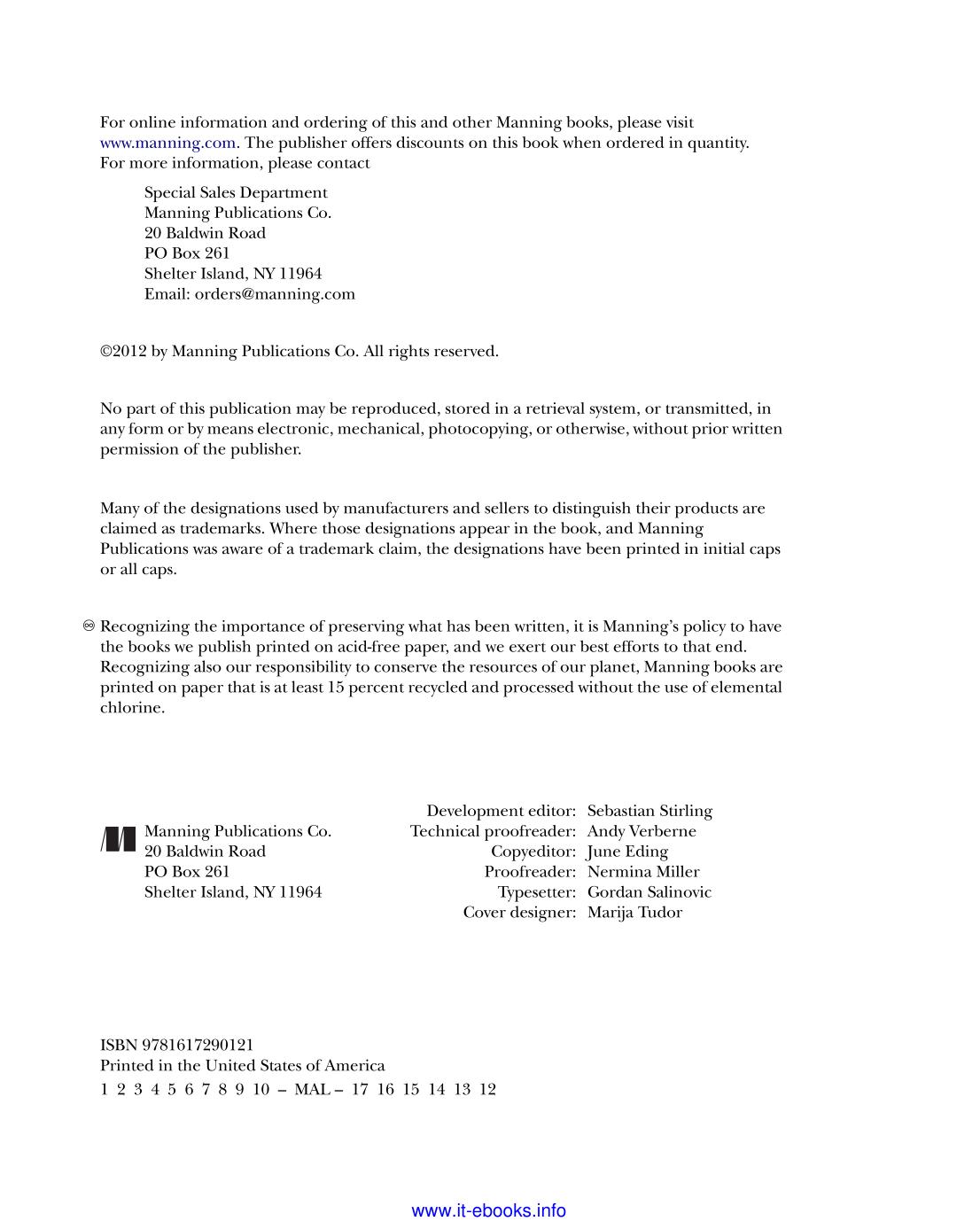 Purchase of the print book comes with an offer of a free PDF, ePub, and Kindle eBook from Manning. Also available is all code from the book.