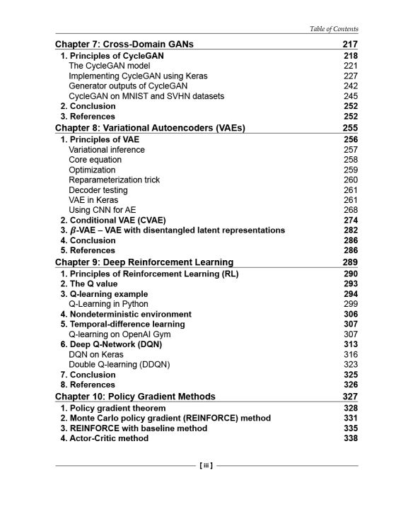Next, you'll discover how a variational autoencoder (VAE) is implemented, and how GANs and VAEs have the generative power to synthesize data that can be extremely convincing to humans. You'll also learn to implement DRL such as Deep Q-Learning and Policy Gradient Methods, which are critical to many modern results in AI.
