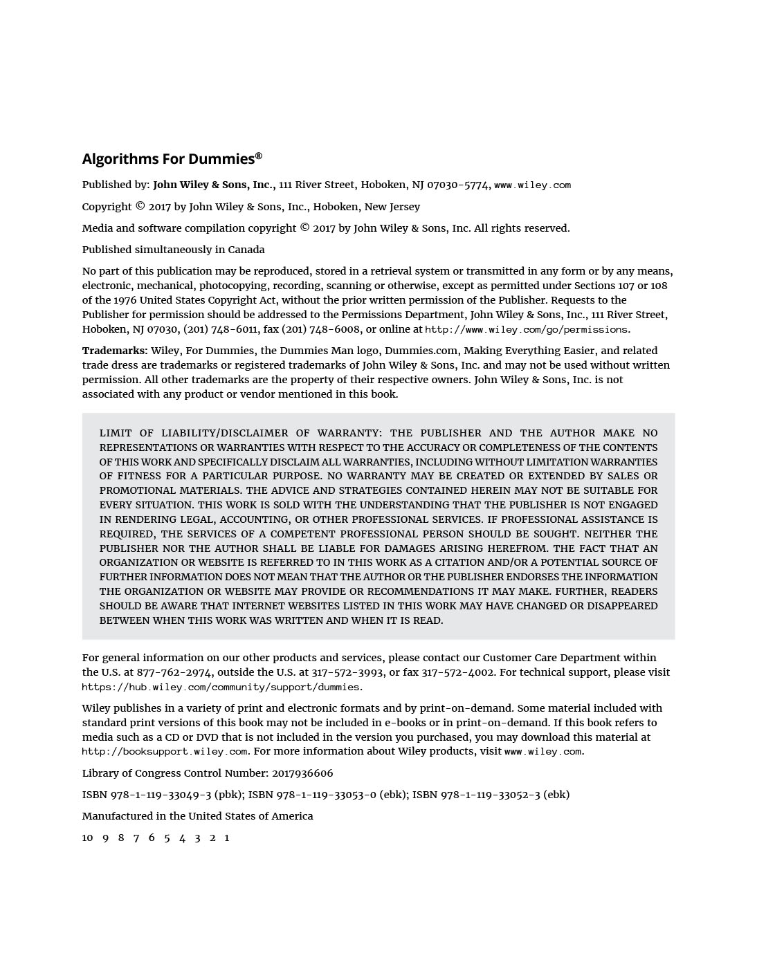 Algorithms for Dummies is a clear and concise primer for everyday people who are interested in algorithms and how they impact our digital lives. Based on the fact that we already live in a world where algorithms are behind most of the technology we use, this book offers eye-opening information on the pervasiveness and importance of this mathematical science—how it plays out in our everyday digestion of news and entertainment, as well as in its influence on our social interactions and consumerism. Readers even learn how to program an algorithm using Python!