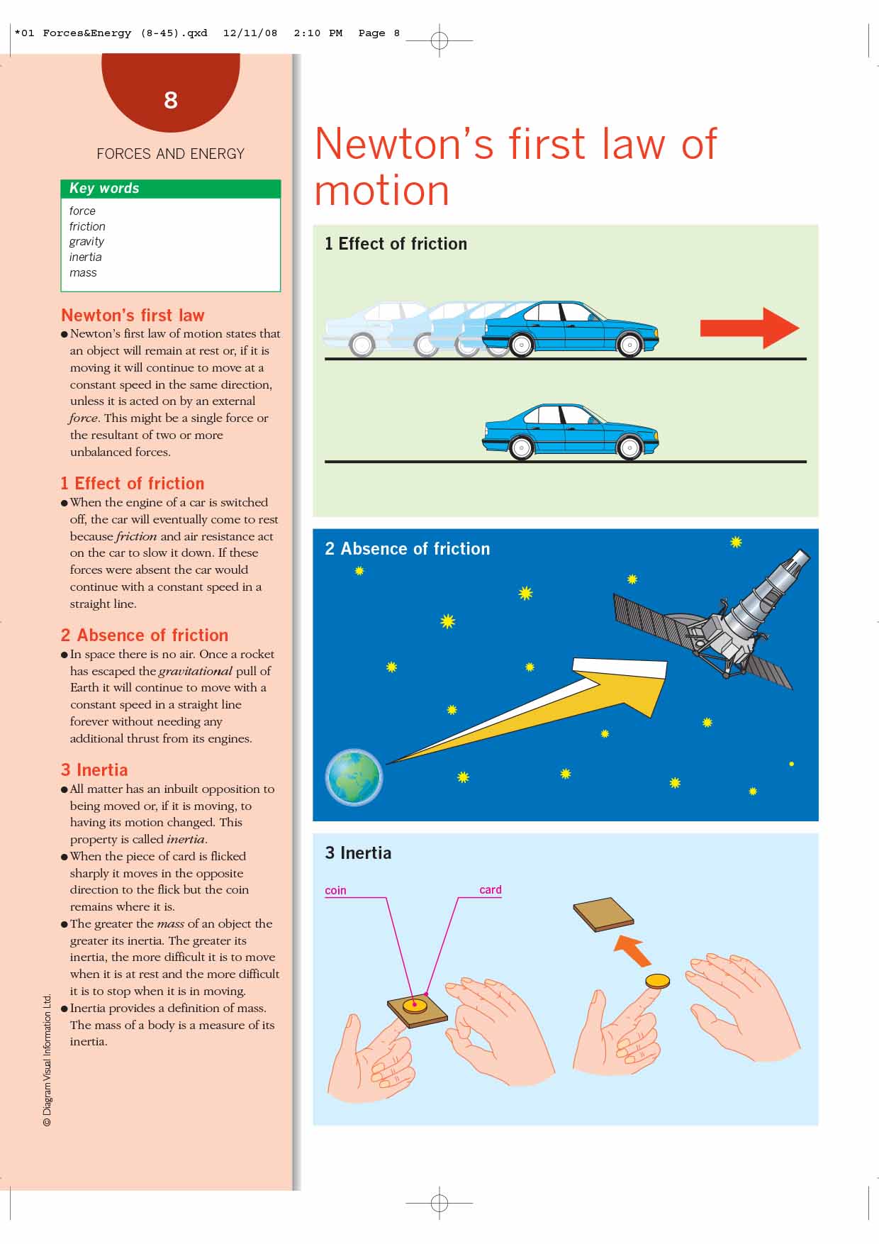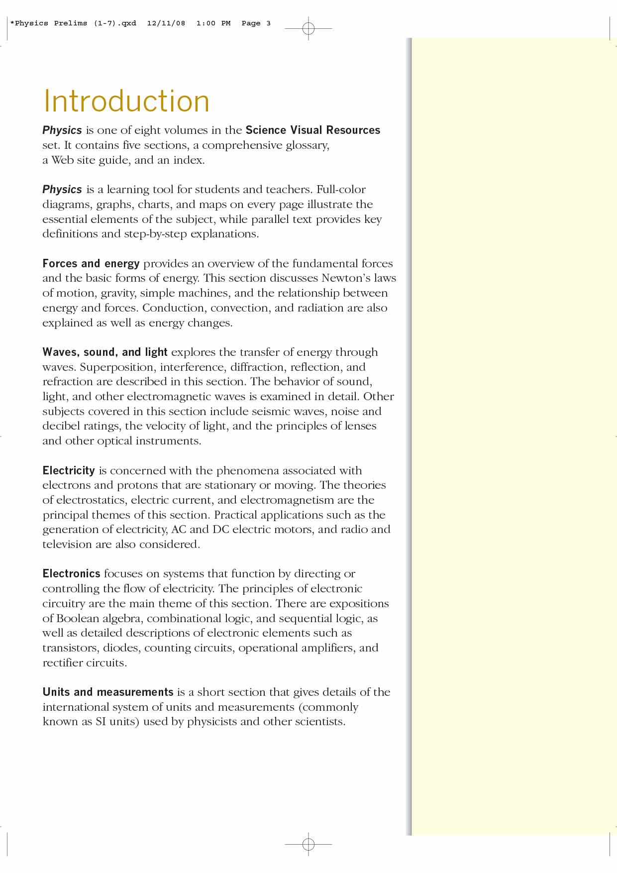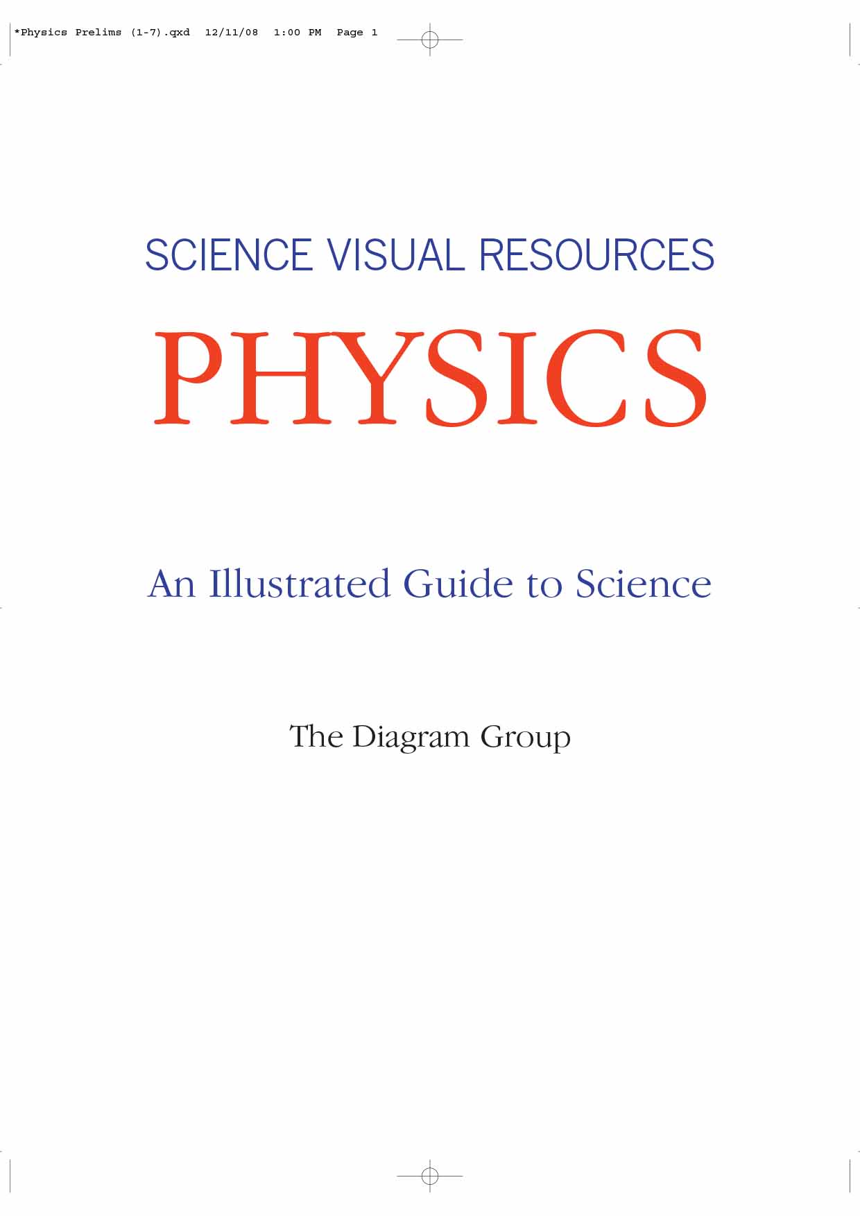 Physics: An Illustrated Guide to Science is one of eight volumes of ''Facts On File's'' new ''Science Visual Resources'' set. Containing five sections, a comprehensive glossary, a Web site guide, and an index, ''Biology'' is an ideal learning tool for students and teachers of science. Full-color diagrams, graphs, charts, and maps on every page illustrate the essential elements of the subject, while parallel text provides key definitions and step-by-step explanations. The five sections include: ''Forces'' - provides an overview of Newton's laws of motion and gravity. It also describes the physics of simple machines and explains the distinction between the concepts of heat and work; ''Energy'' - examines the concept of energy in more detail. This section covers thermal conduction, radiation, and convection, as well as describes changes in energy type. The industrial production of energy as well as possible sources of renewable energy are also described here; ''Waves, Sound, and Light'' - is concerned with the wave