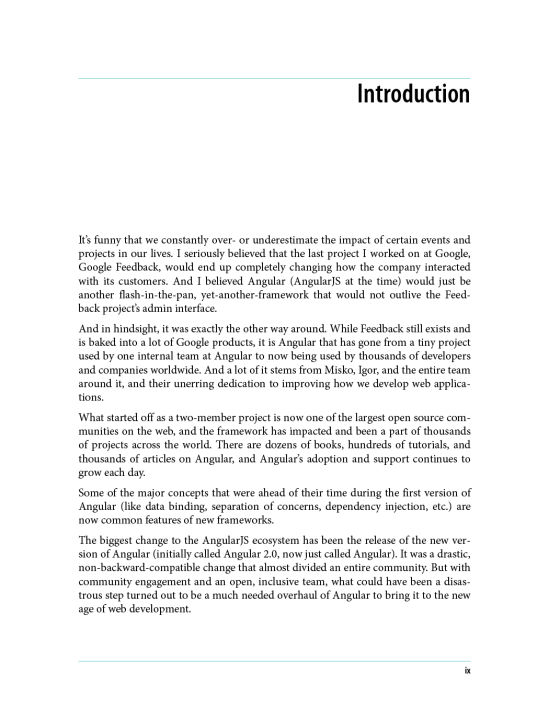 Angular: Up & Running covers most of the major pieces of Angular, but in a structured manner that is generally used in hands-on training. Each chapter takes one concept, and use examples to cover how it works. Problems to work on (with solutions) at the end of each chapter reinforce the learnings of each chapter and allow readers to really get hands-on with Angular.