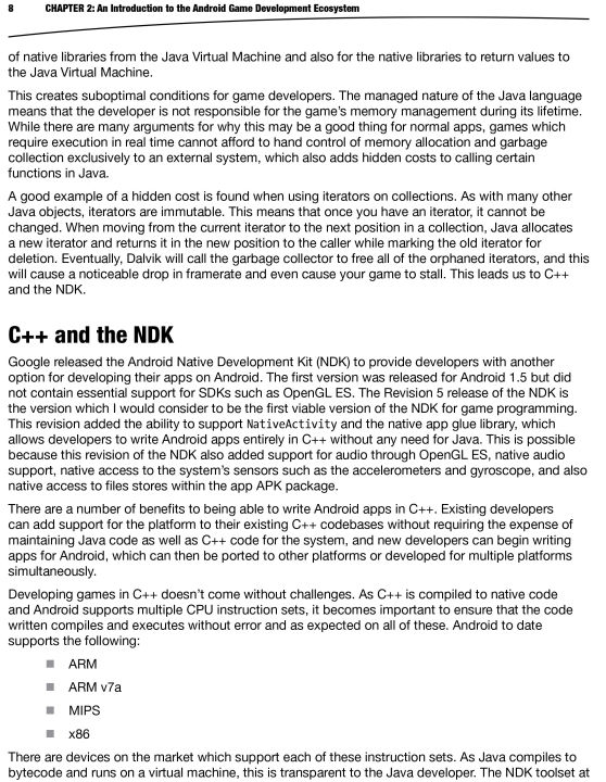 Beginning Android C++ Game Development introduces general and Android game developers like you to Android's powerful Native Development Kit (NDK). The Android NDK platform allows you to build the most sophisticated, complex and best performing game apps that leverage C++. In short, you learn to build professional looking and performing game apps like the book's case study, Droid Runner.