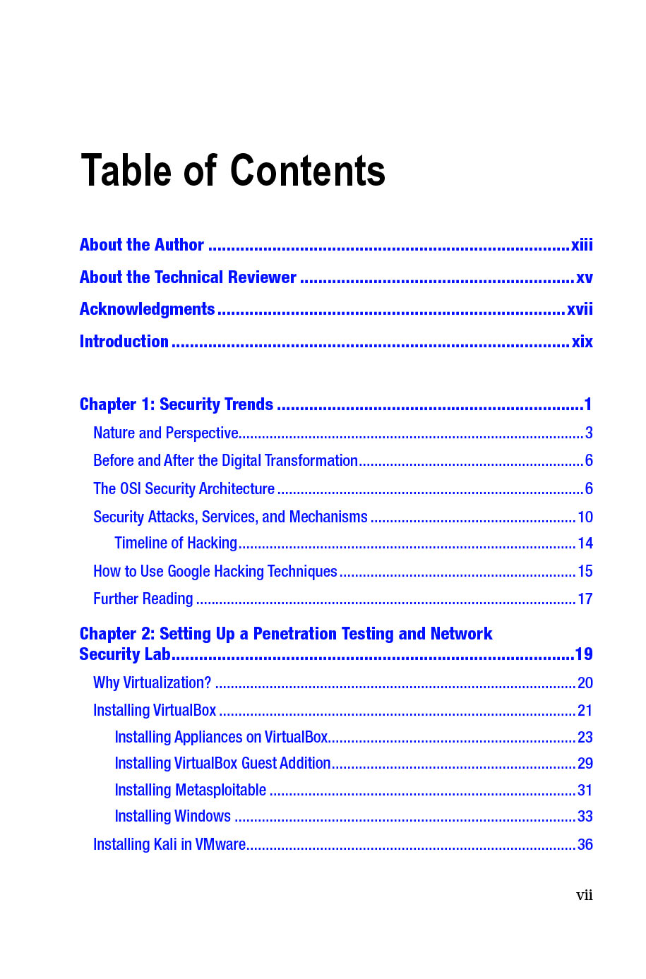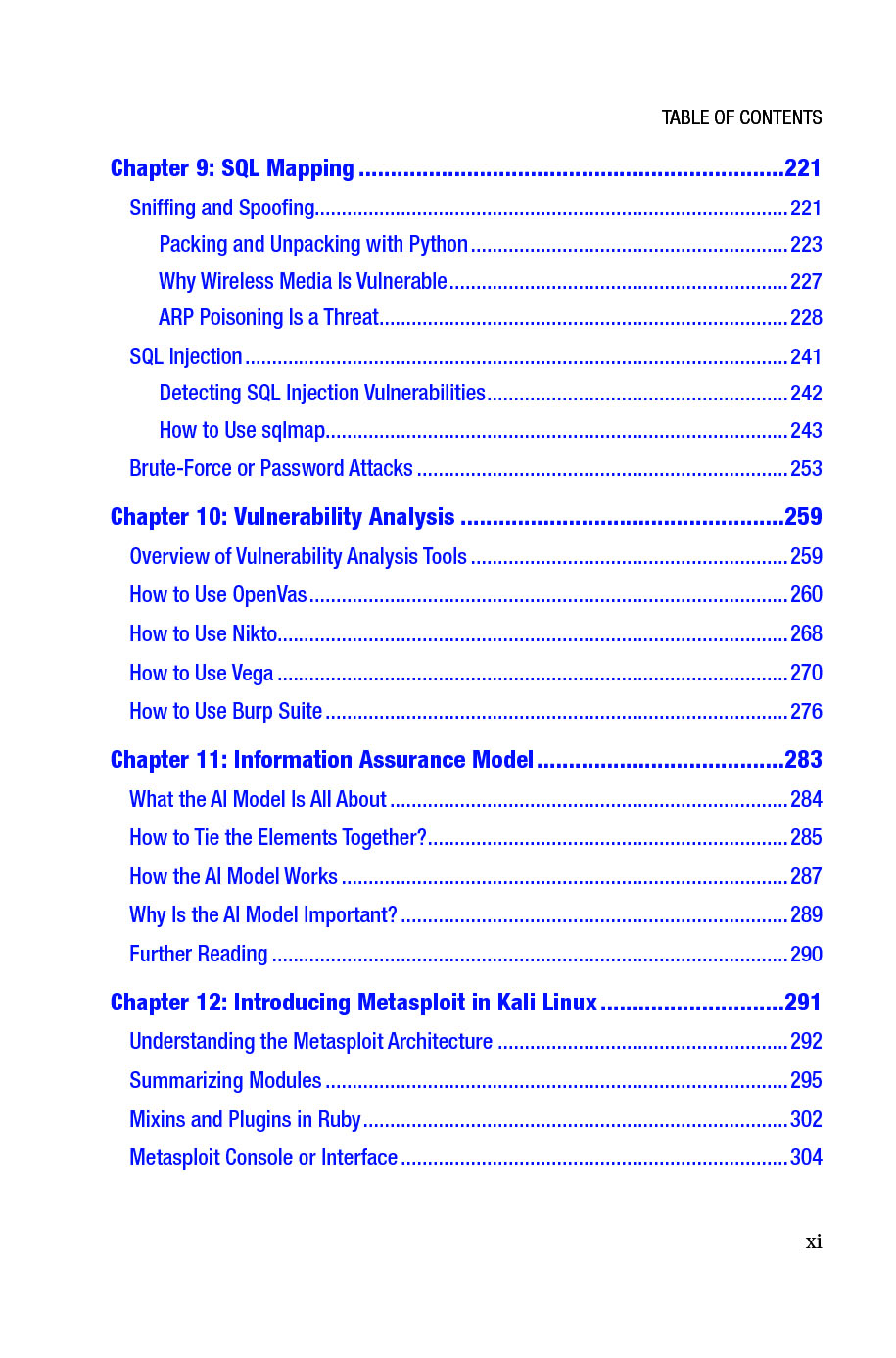 The coverage of vulnerability analysis includes sniffing and spoofing, why ARP poisoning is a threat, how SniffJoke prevents poisoning, how to analyze protocols with Wireshark, and using sniffing packets with Scapy. The next part of the book shows you detecting SQL injection vulnerabilities, using sqlmap, and applying brute force or password attacks. Besides learning these tools, you will see how to use OpenVas, Nikto, Vega, and Burp Suite.