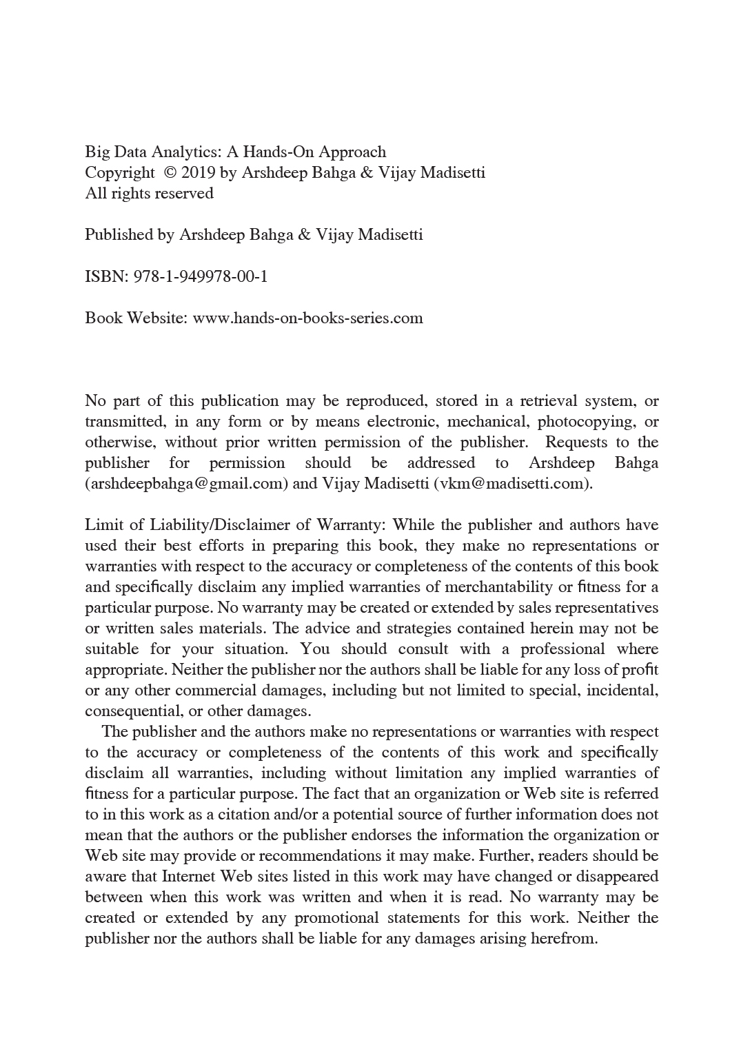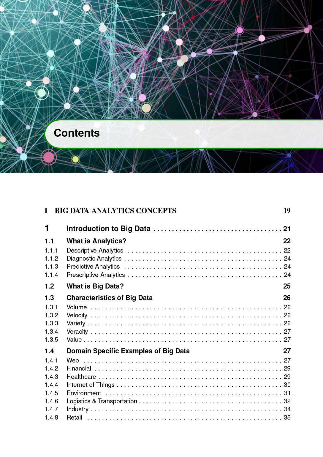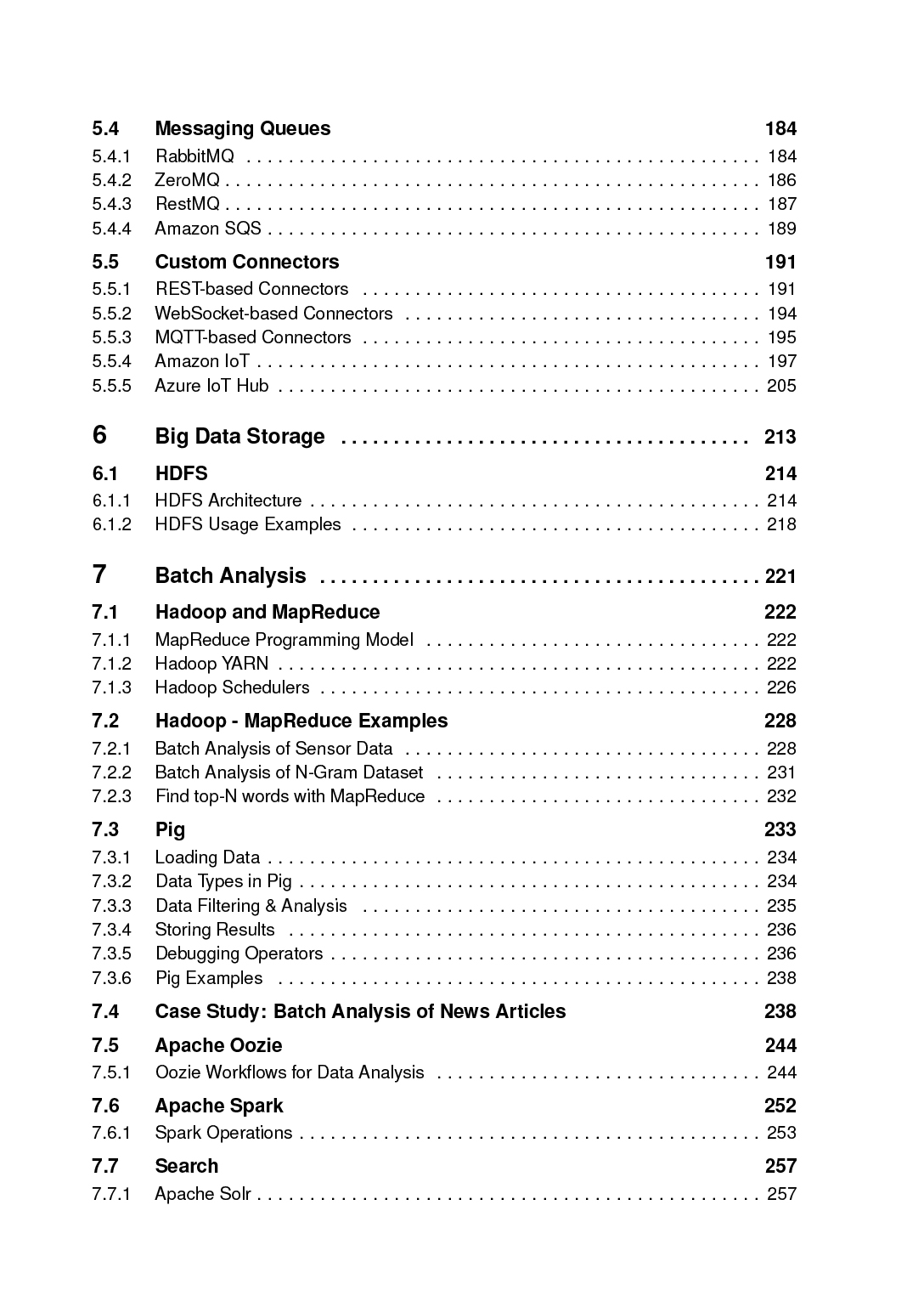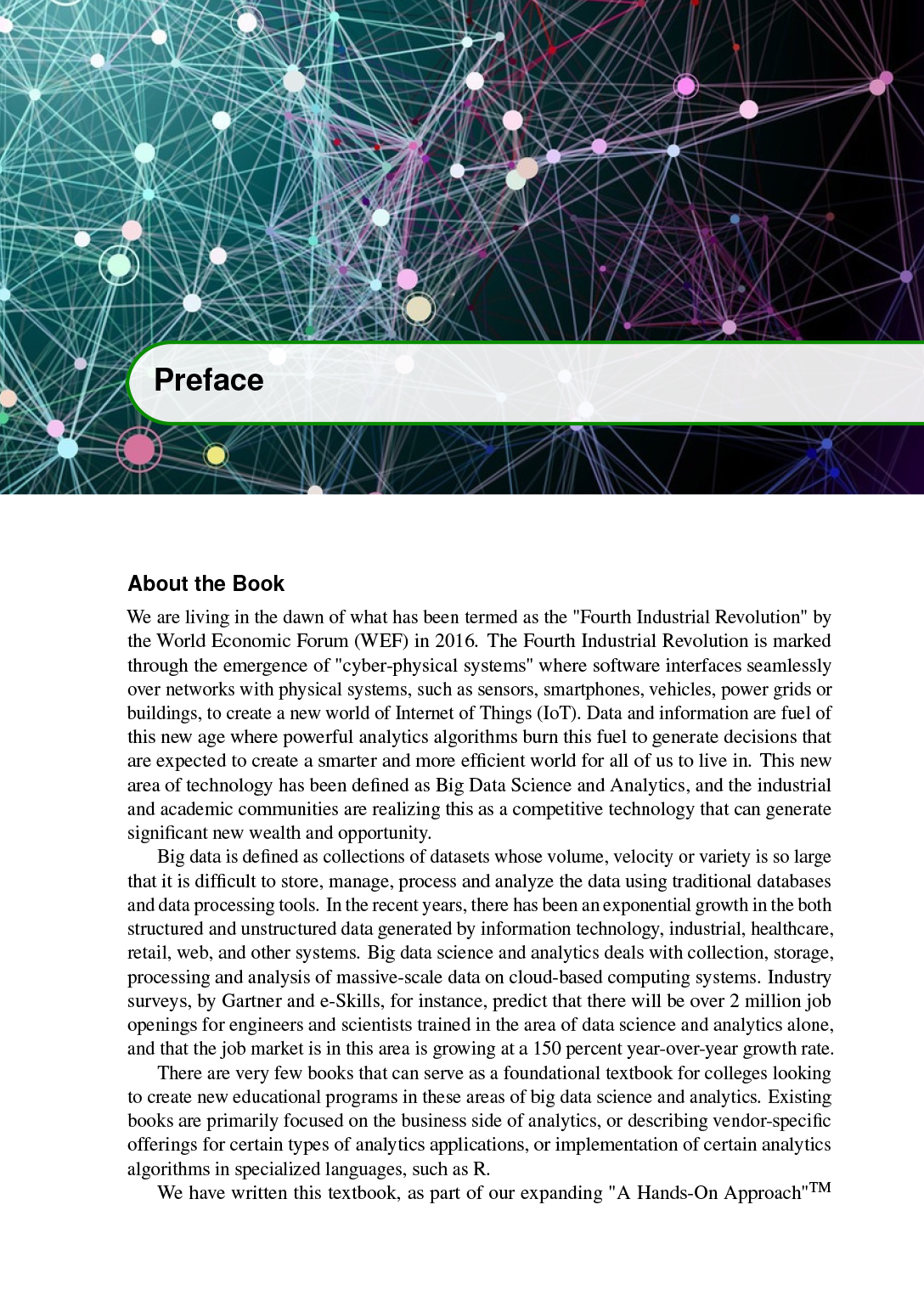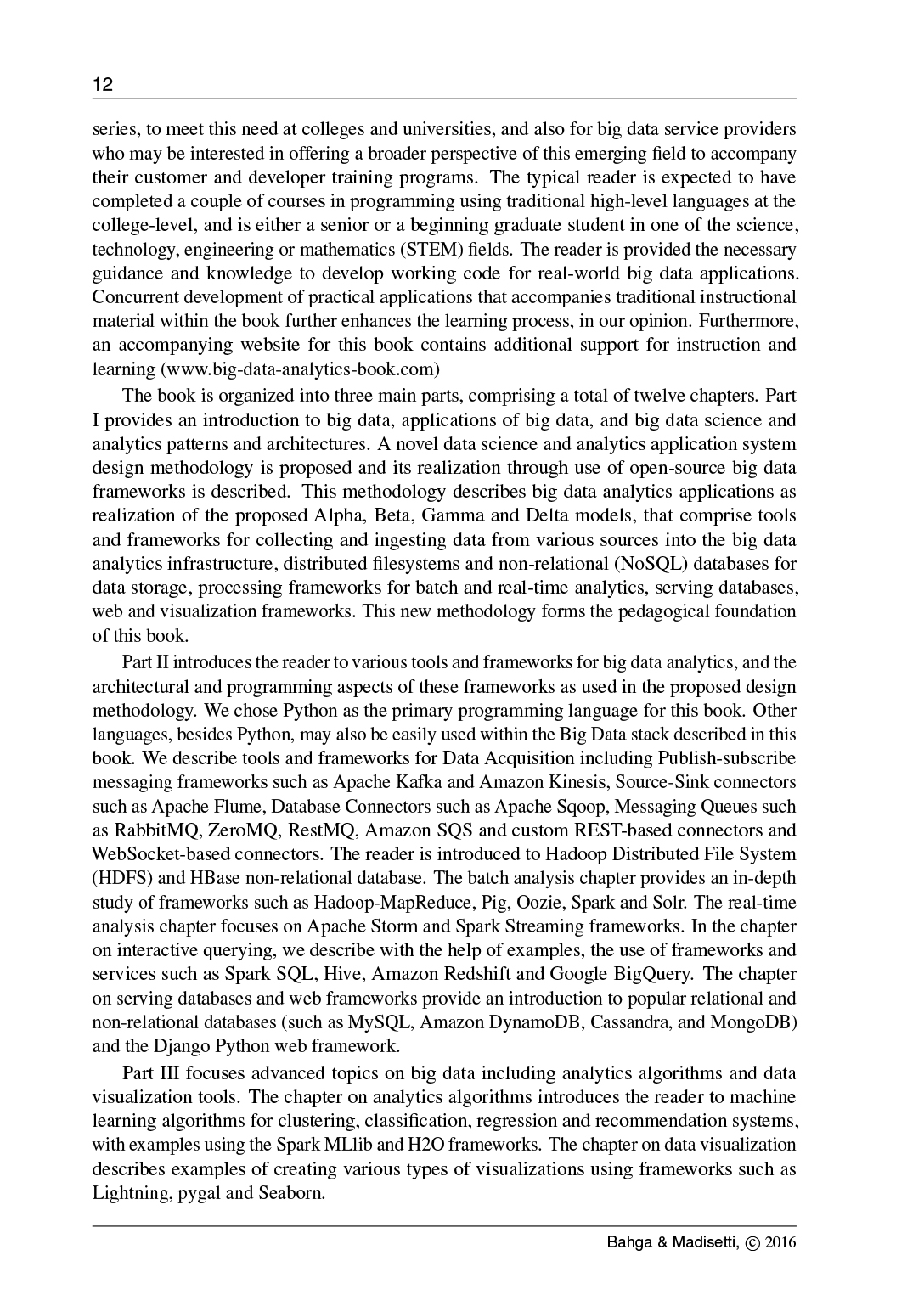 Part III focuses advanced topics on big data including analytics algorithms and data visualization tools. The chapter on analytics algorithms introduces the reader to machine learning algorithms for clustering, classification, regression and recommendation systems, with examples using the Spark MLlib and H2O frameworks. The chapter on data visualization describes examples of creating various types of visualizations using frameworks such as Lightning, pygal and Seaborn.