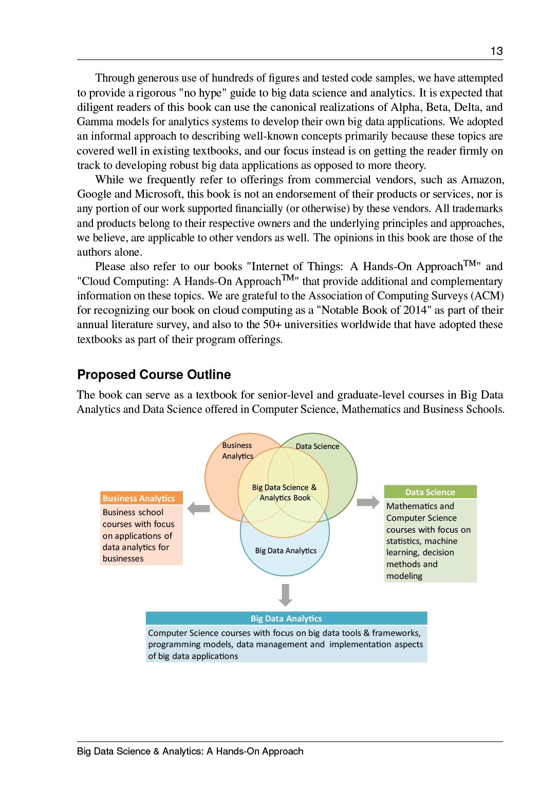 The book is organized into three main parts, comprising a total of twelve chapters. Part I provides an introduction to big data, applications of big data, and big data science and analytics patterns and architectures. A novel data science and analytics application system design methodology is proposed and its realization through use of open-source big data frameworks is described. This methodology describes big data analytics applications as realization of the proposed Alpha, Beta, Gamma and Delta models, that comprise tools and frameworks for collecting and ingesting data from various sources into the big data analytics infrastructure, distributed filesystems and non-relational (NoSQL) databases for data storage, processing frameworks for batch and real-time analytics, serving databases, web and visualization frameworks. This new methodology forms the pedagogical foundation of this book.