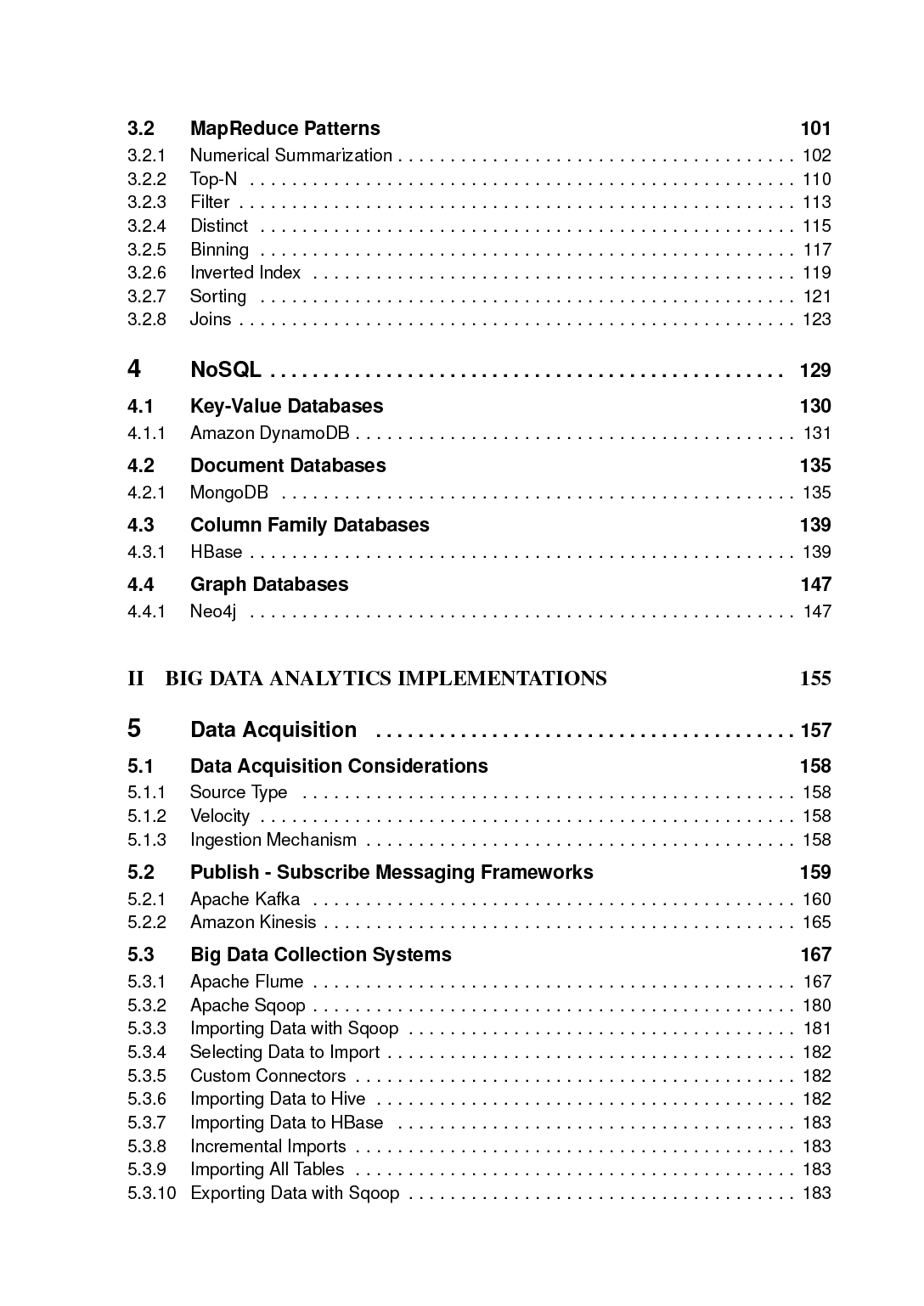 Part II introduces the reader to various tools and frameworks for big data analytics, and the architectural and programming aspects of these frameworks as used in the proposed design methodology. We chose Python as the primary programming language for this book. Other languages, besides Python, may also be easily used within the Big Data stack described in this book. We describe tools and frameworks for Data Acquisition including Publish-subscribe messaging frameworks such as Apache Kafka and Amazon Kinesis, Source-Sink connectors such as Apache Flume, Database Connectors such as Apache Sqoop, Messaging Queues such as RabbitMQ, ZeroMQ, RestMQ, Amazon SQS and custom REST-based connectors and WebSocket-based connectors. The reader is introduced to Hadoop Distributed File System (HDFS) and HBase non-relational database. The batch analysis chapter provides an in-depth study of frameworks such as Hadoop-MapReduce, Pig, Oozie, Spark and Solr. The real-time analysis chapter focuses on Apache Storm and Spark Streaming frameworks. In the chapter on interactive querying, we describe with the help of examples, the use of frameworks and services such as Spark SQL, Hive, Amazon Redshift and Google BigQuery. The chapter on serving databases and web frameworks provide an introduction to popular relational and non-relational databases (such as MySQL, Amazon DynamoDB, Cassandra, and MongoDB) and the Django Python web framework.