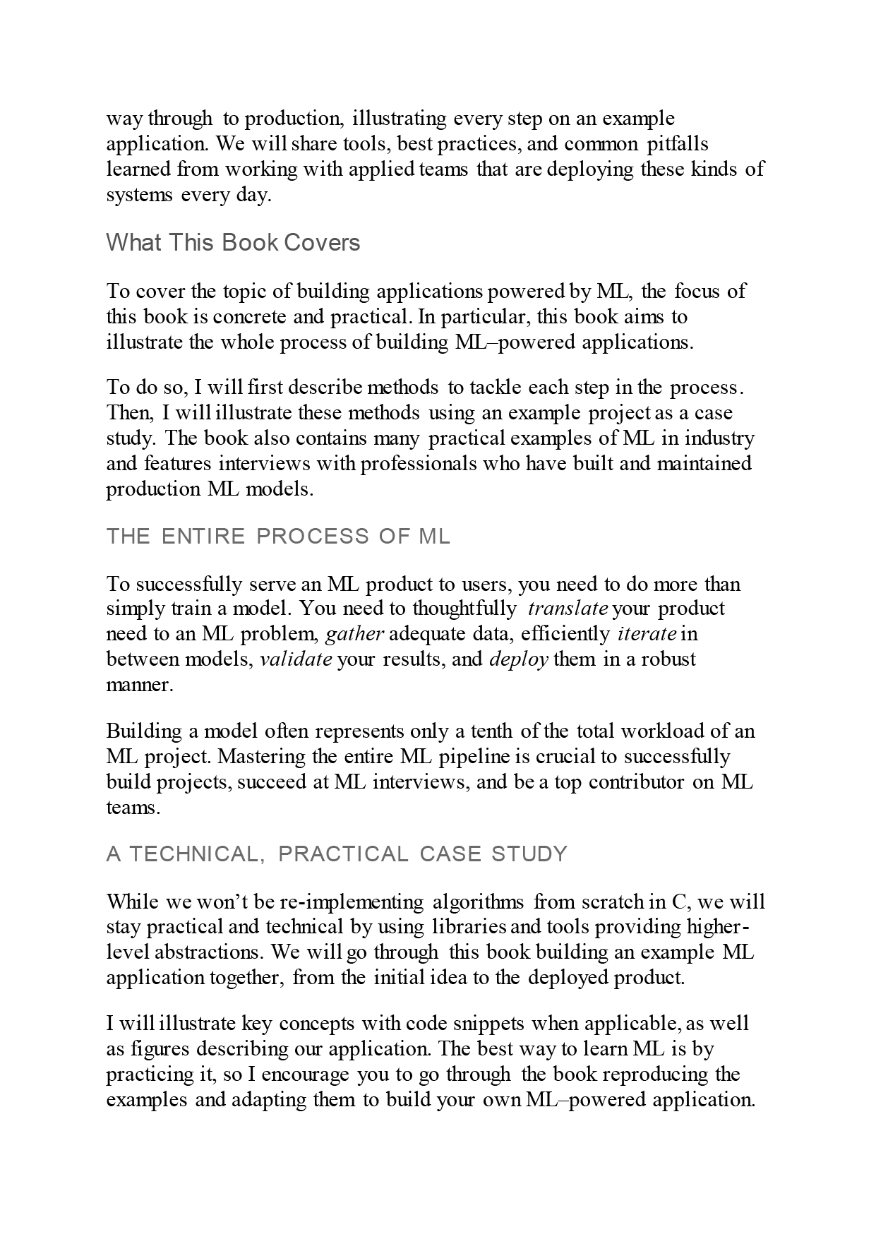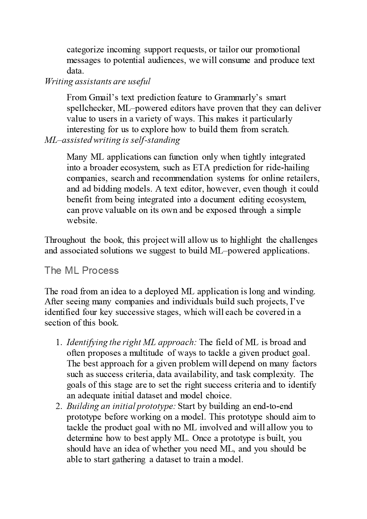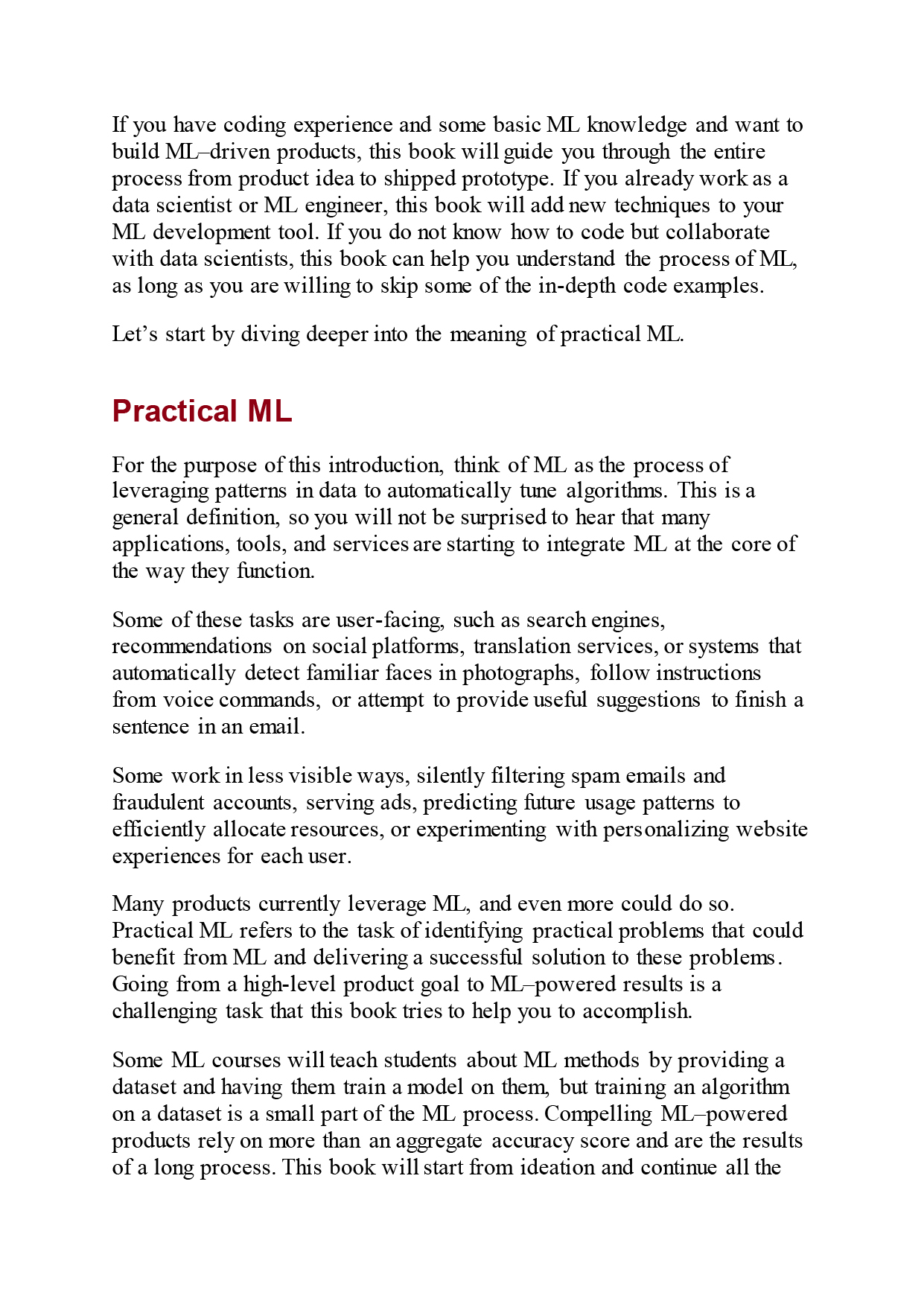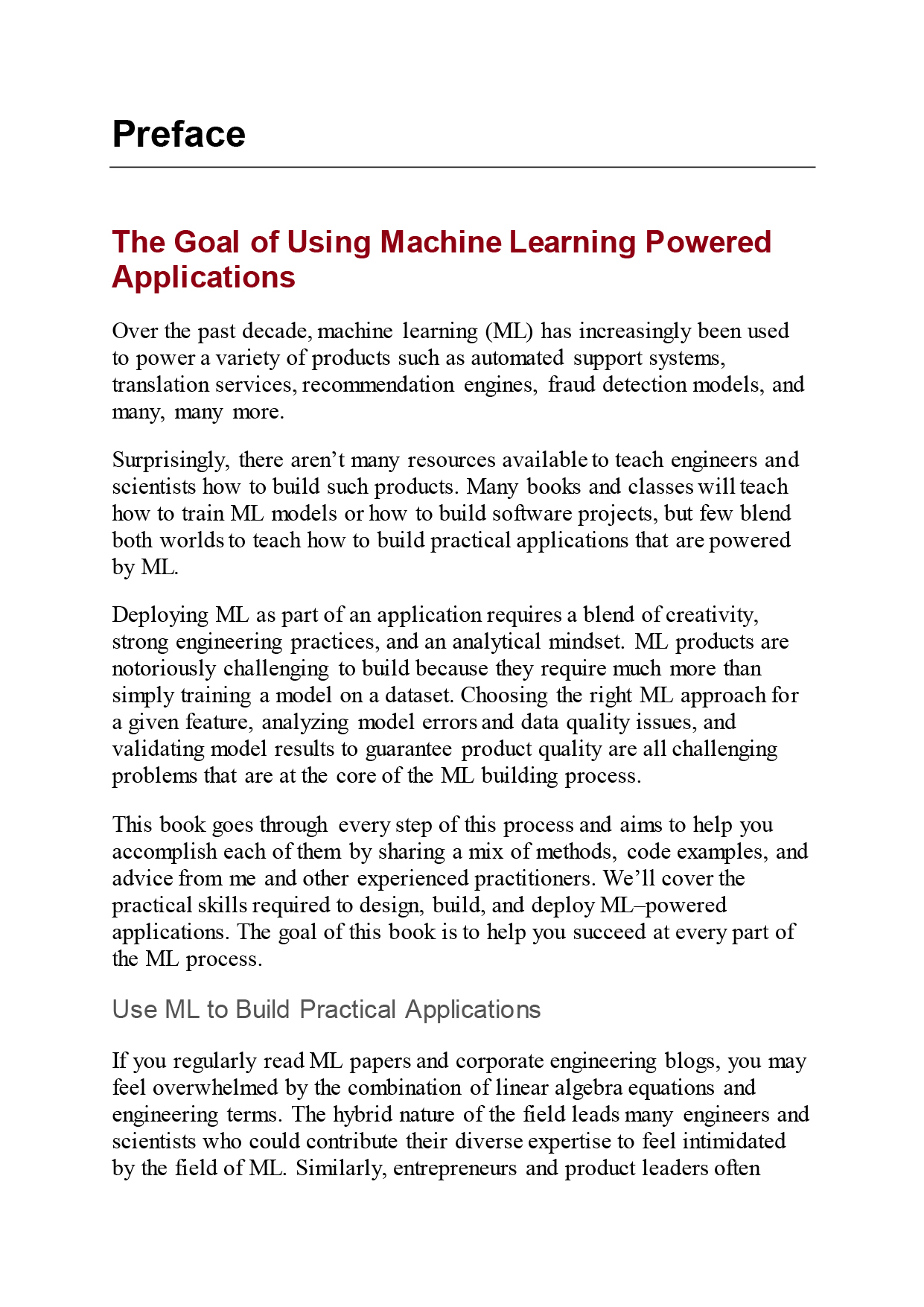 The first part of this guide shows you how to plan and measure success for an ML application. Part II shows you how to build a working ML model, and Part III explains how to improve the model until it fulfills your original vision. Part IV covers deployment and monitoring strategies.