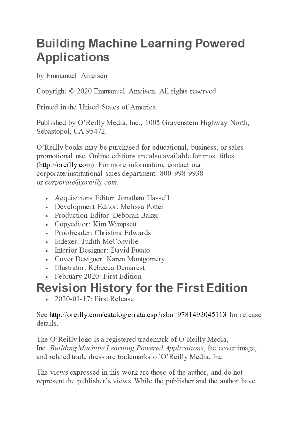 Author Emmanuel Ameisen, who worked as a data scientist at Zipcar and led Insight Data Science’s AI program, demonstrates key ML concepts with code snippets, illustrations, and screenshots from the book’s example application.