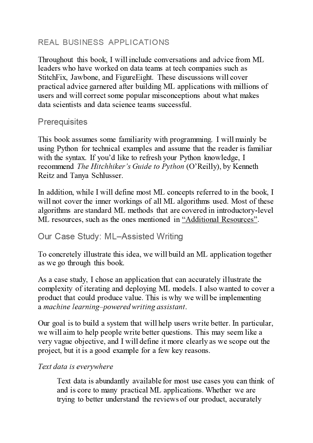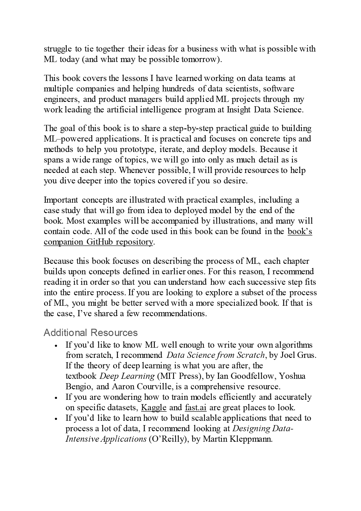 Learn the skills necessary to design, build, and deploy applications powered by machine learning. Through the course of this hands-on book, you’ll build an example ML-driven application from initial idea to deployed product. Data scientists, software engineers, and product managers with little or no ML experience will learn the tools, best practices, and challenges involved in building a real-world ML application step-by-step.