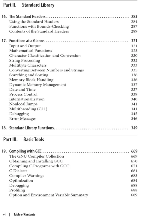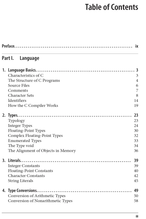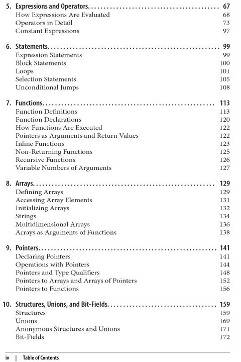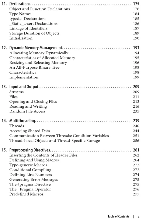 C language concepts and language elements, with separate chapters on types, statements, pointers, memory management, I/O, and more