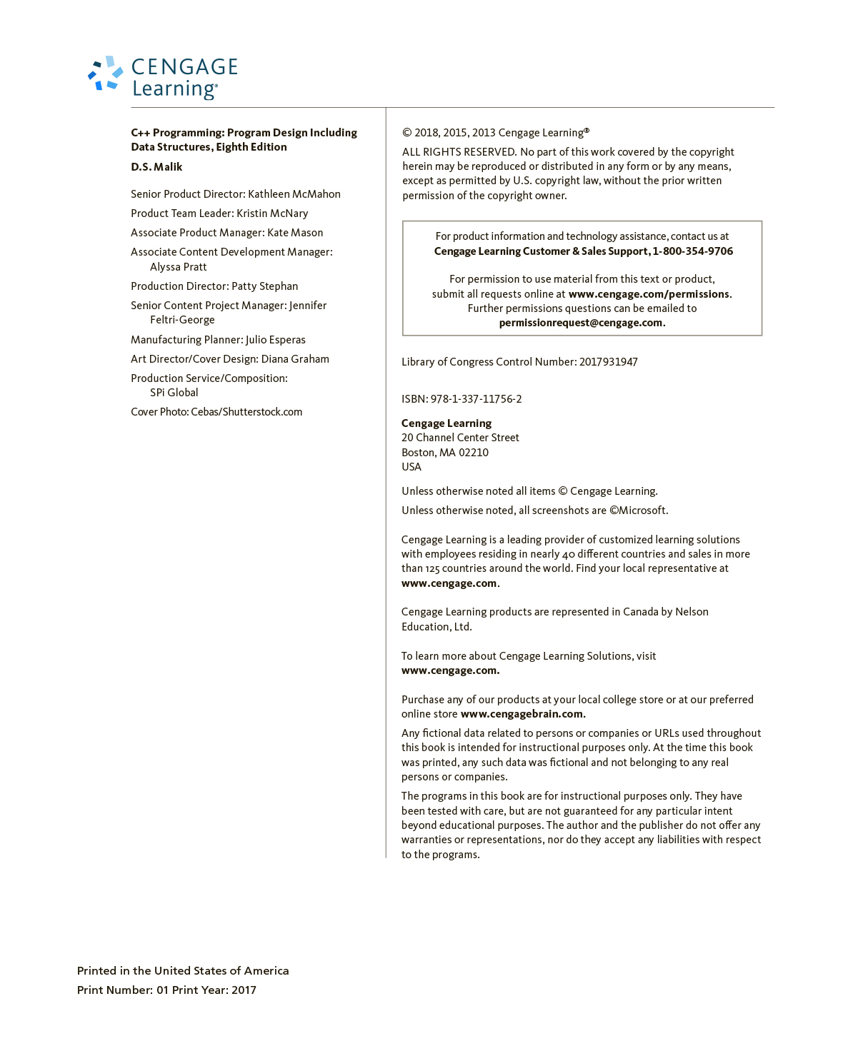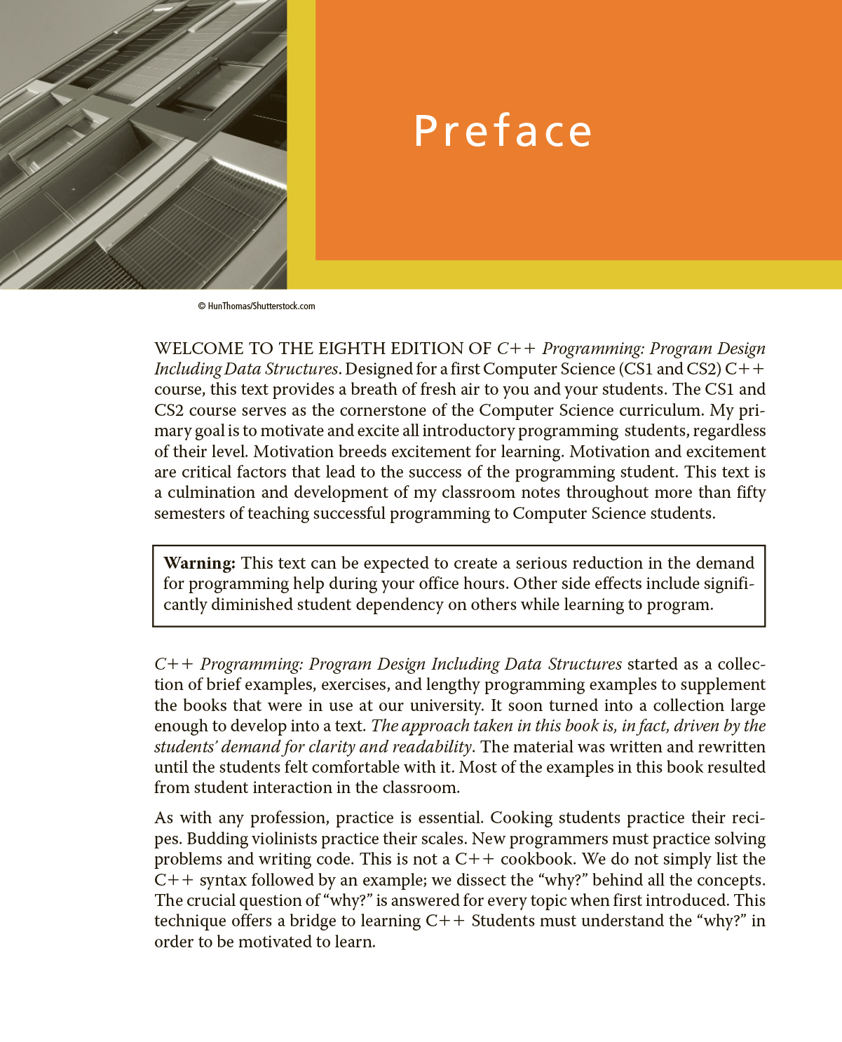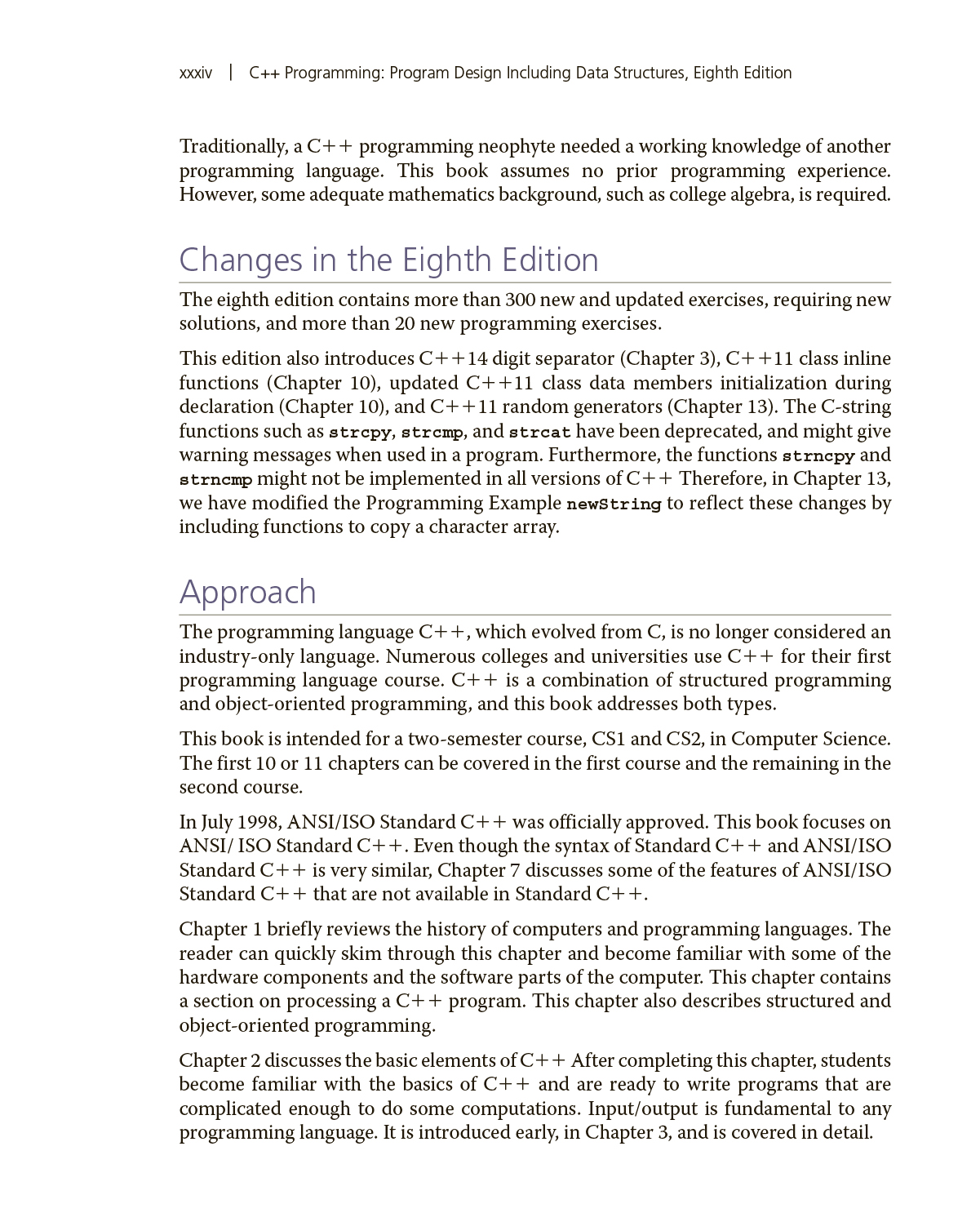 first programming language experience -- C++ PROGRAMMING: PROGRAM DESIGN INCLUDING DATA STRUCTURES, 8E. D.S. Malik’s time-tested,student-centered methodology incorporates a strong focus onproblem-solving with full-code examples that vividly demonstrate the hows and whys of applying programming concepts and utilizing C++ to work through a problem. Thoroughly updated end-of-chapter exercises, more than 20 extensive new programming exercises, and numerous new examples drawn from Dr. Malik’s experience further strengthen your understanding of problem solving and program design in this new edition. You review the important features of C++ 14 Standard with timely discussions that