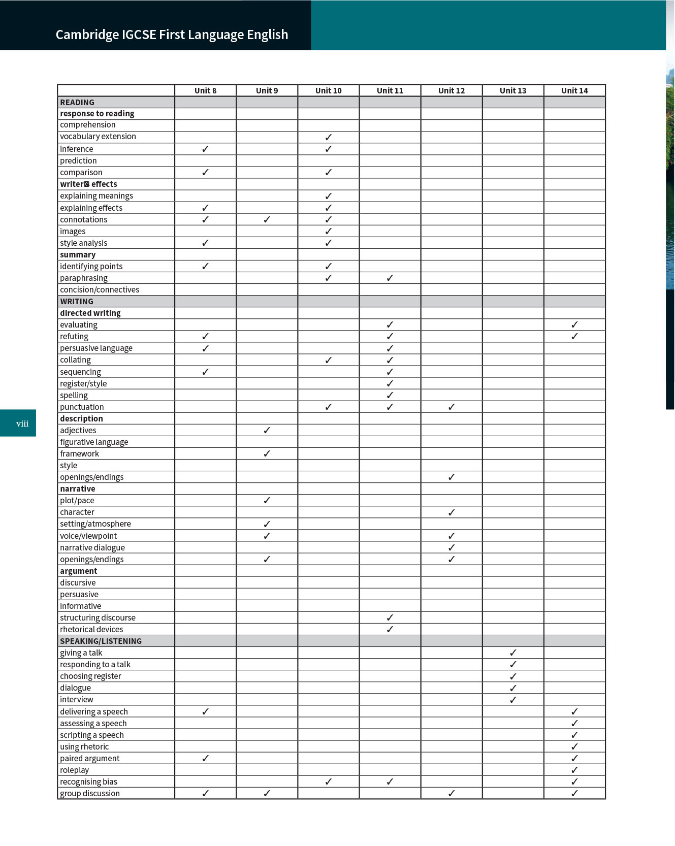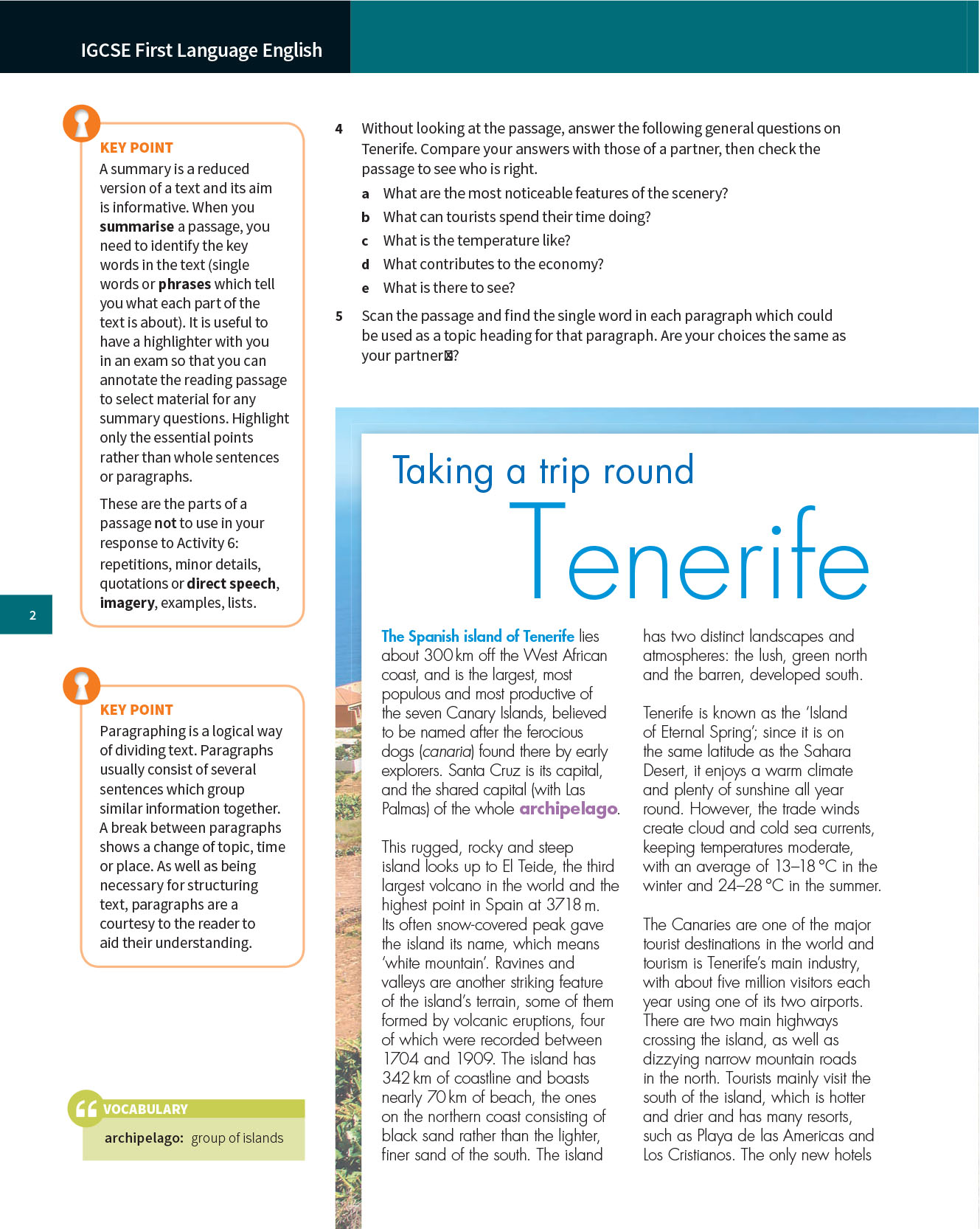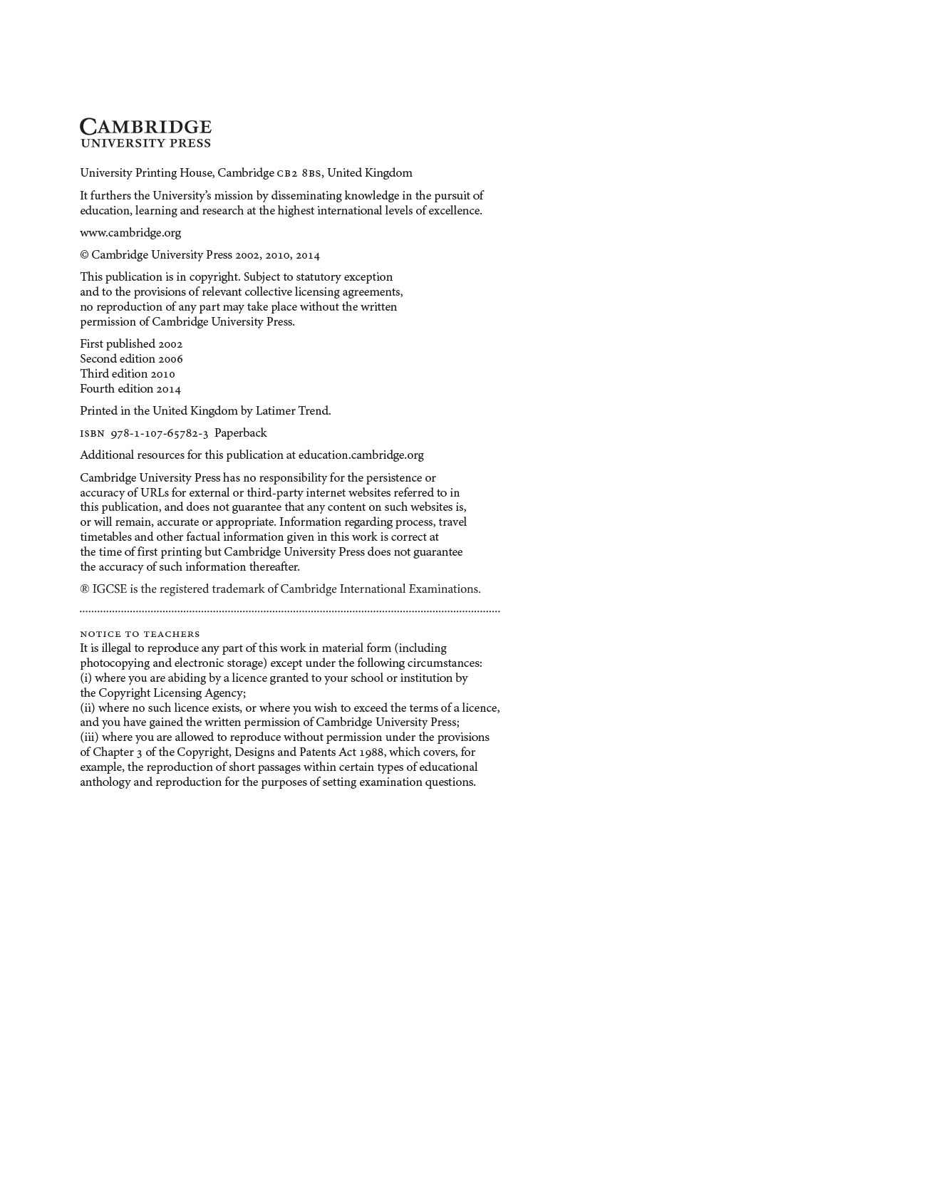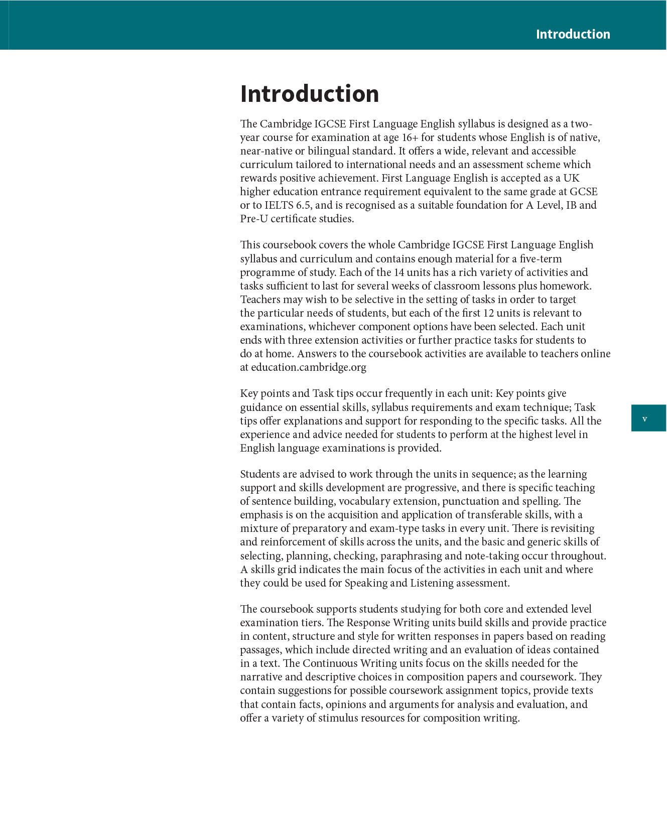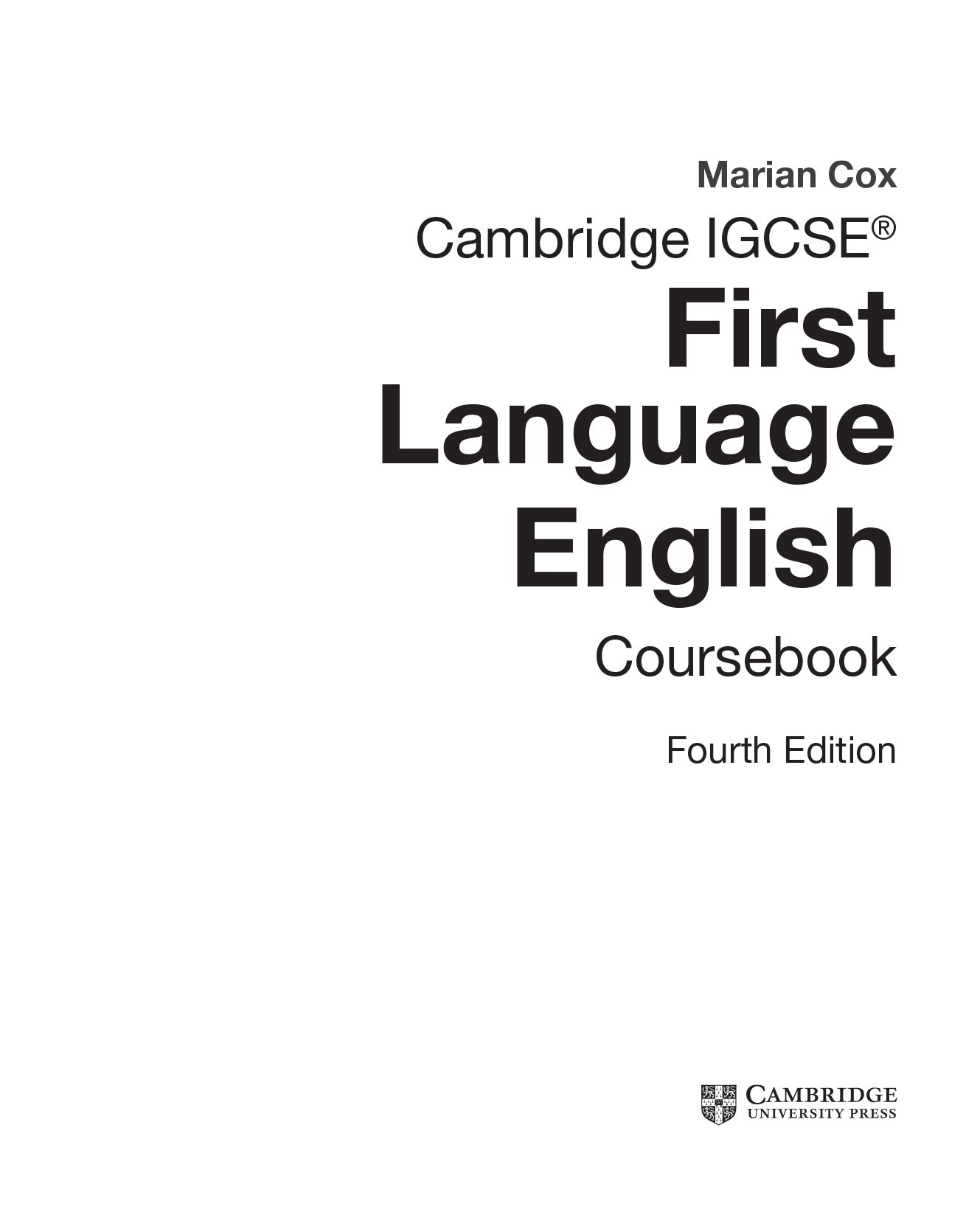 Up-to-date resources providing full coverage of Cambridge IGCSE First Language English (0500 and 0522) for first examination in 2015. This Fourth edition Coursebook is designed to support the Cambridge IGCSE First Language English (0500) and Cambridge International Level 1/Level 2 Certificate First Language English (0522). A student-friendly resource that teaches the reading and writing techniques required for the Cambridge IGCSE, as well as providing two bespoke units on speaking and listening techniques, plus embedded activities on these skills throughout. It includes carefully designed activities on a variety of engaging topics, set out in 14 lively, full-colour units. A dedicated microsite for Cambridge First Language English provides free online resources to support the course, including answers to the Coursebook activities.