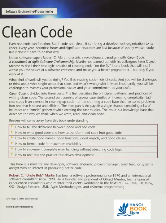 Even bad code can function. But if code isn’t clean, it can bring a development organization to its knees. Every year, countless hours and significant resources are lost because of poorly written code. But it doesn’t have to be that way. Noted software expert Robert C. Martin, presents a revolutionary paradigm with Clean Code: A Handbook of Agile Software Craftsmanship. Martin, who has helped bring agile principles from a practitioner’s point of view to tens of thousands of programmers, has teamed up with his colleagues from Object Mentor to distill their best agile practice of cleaning code “on the fly” into a book that will instill within you the values of software craftsman, and make you a better programmer―but only if you work at it. What kind of work will you be doing? You’ll be reading code―lots of code. And you will be challenged to think about what’s right about that code, and what’s wrong with it. More importantly you will be challenged to reassess your professional values and your commitment to your craft. Clean Code is divided into three parts. The first describes the principles, patterns, and practices of writing clean code. The second part consists of several case studies of increasing complexity. Each case study is an exercise in cleaning up code―of transforming a code base that has some problems into one that is sound and efficient. The third part is the payoff: a single chapter containing a list of heuristics and “smells” gathered while creating the case studies. The result is a knowledge base that describes the way we think when we write, read, and clean code. Readers will come away from this book understanding How to tell the difference between good and bad code How to write good code and how to transform bad code into good code How to create good names, good functions, good objects, and good classes How to format code for maximum readability How to implement complete error handling without obscuring code logic How to unit test and practice test-driven development What “smells” and heuristics can help you identify bad code This book is a must for any developer, software engineer, project manager, team lead, or systems analyst with an interest in producing better code.
