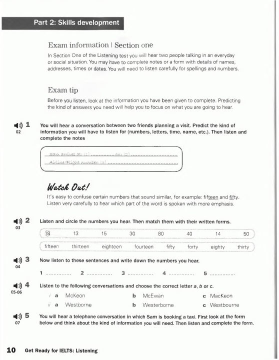 • ‘Watch out!’ sections that highlight common errors made by learners in the IELTS Listening test