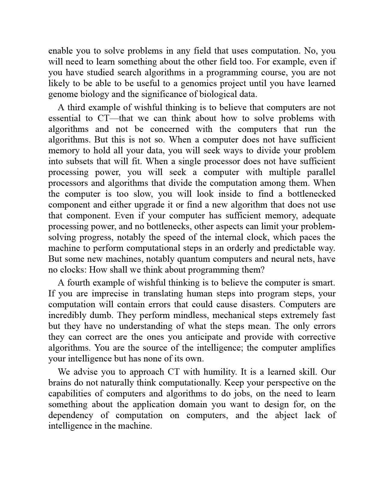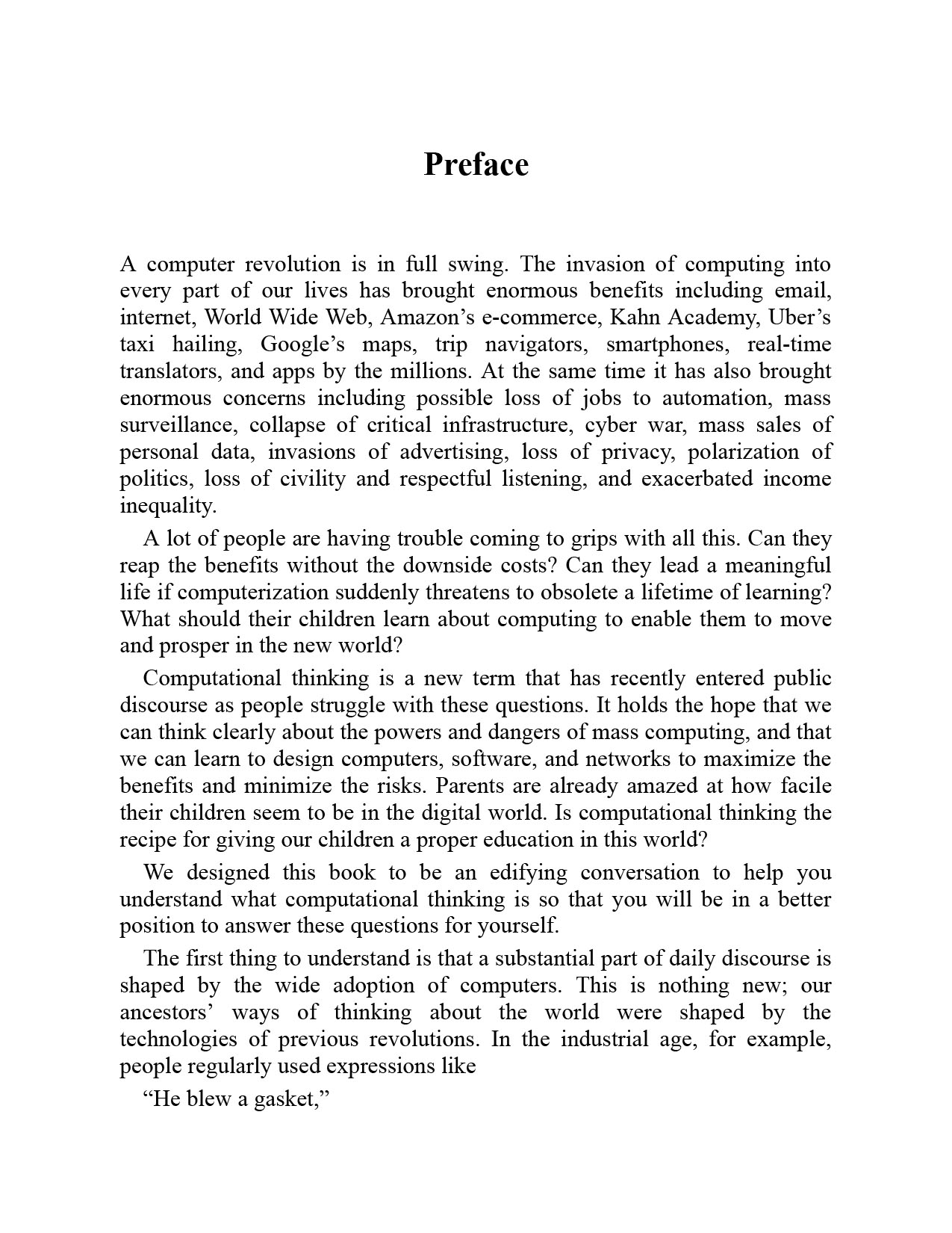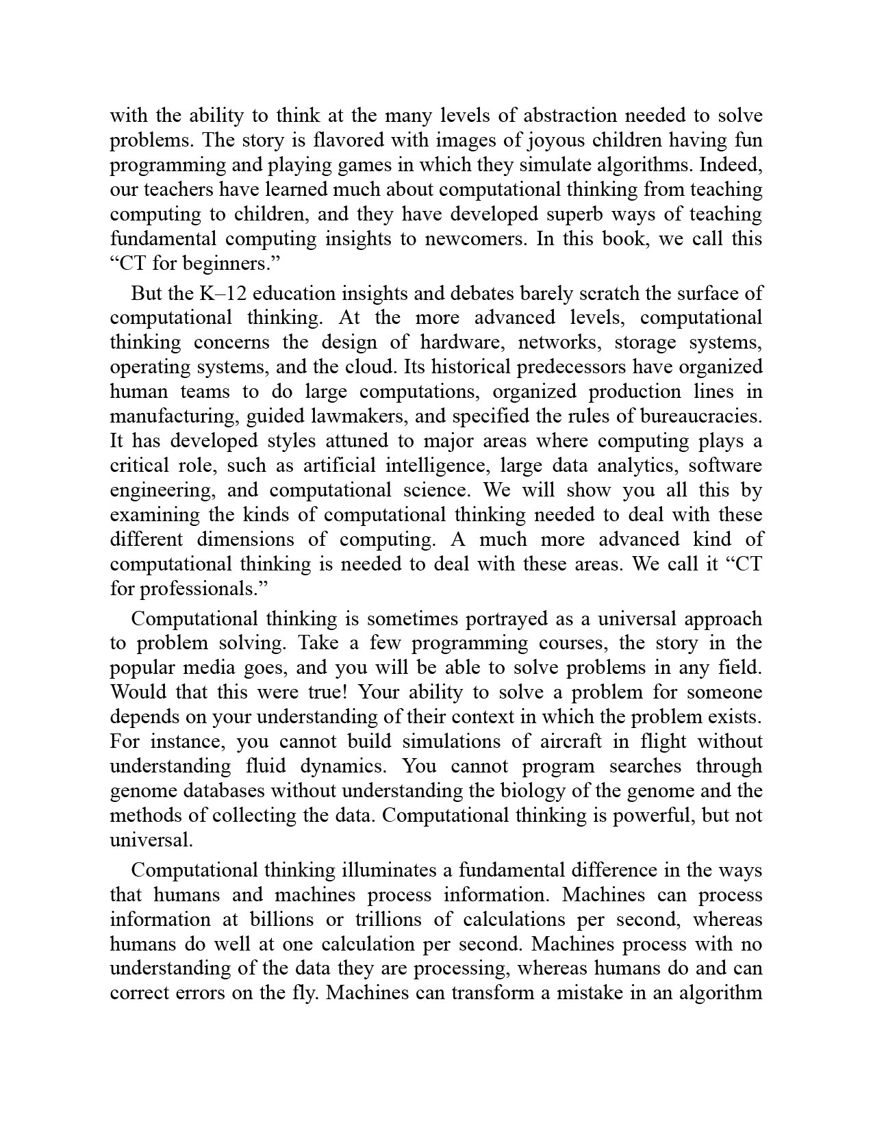 The authors explain that computational thinking (CT) is not a set of concepts for programming; it is a way of thinking that is honed through practice: the mental skills for designing computations to do jobs for us, and for explaining and interpreting the world as a complex of information processes. Mathematically trained experts (known as "computers") who performed complex calculations as teams engaged in CT long before electronic computers. The authors identify six dimensions of today's highly developed CT--methods, machines, computing education, software engineering, computational science, and design--and cover each in a chapter. Along the way, they debunk inflated claims for CT and computation while making clear the power of CT in all its complexity and multiplicity.