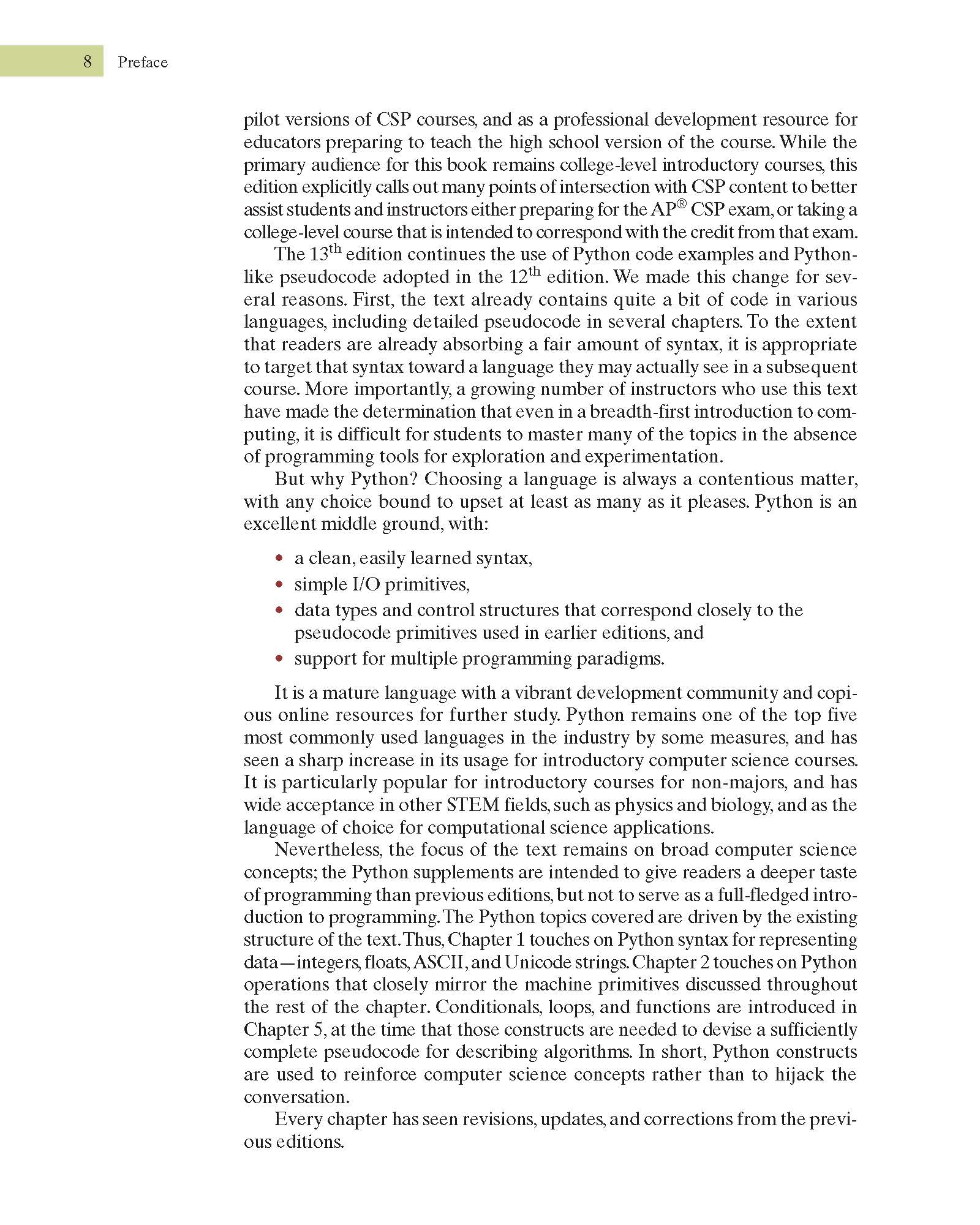 More than 1,000 questions and exercises, Chapter Review Problems, and Social Issues questions reinforce core concepts. The 13th Edition continues its focus on Python to provide programming tools for exploration and experimentation. A new full-color design reflects the use of color in most modern programming interfaces to aid the programmer’s understanding of code. Syntax coloring is now used more effectively for clarifying code and pseudocode segments in the text, and many figures and diagrams are now rendered more descriptively.