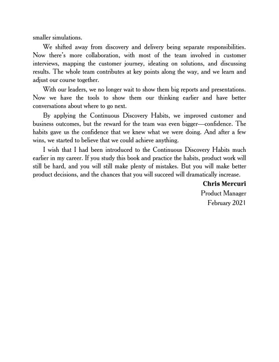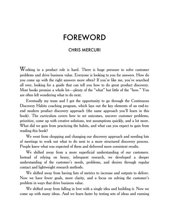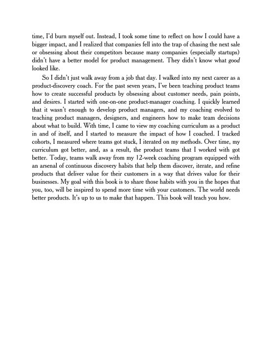 In this book, you'll learn a structured and sustainable approach to continuous discovery that will help you answer each of these questions, giving you the confidence to act while also preparing you to be wrong. You'll learn to balance action with doubt so that you can get started without being blindsided by what you don't get right.