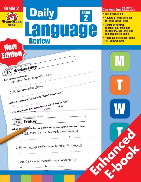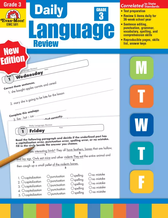 * Monday-Thursday (five items) - two sentences to edit, including corrections in punctuation, capitalization, spelling, grammar, vocabulary, plus three items that practice a variety of language and reading skills.
