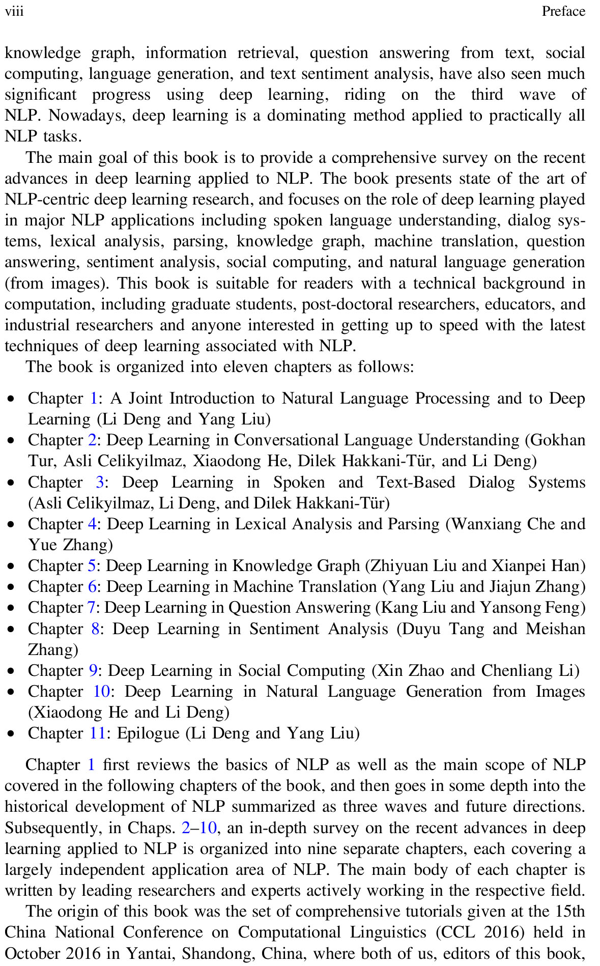 This book reviews the state of the art of deep learning research and its successful applications to major NLP tasks, including speech recognition and understanding, dialogue systems, lexical analysis, parsing, knowledge graphs, machine translation, question answering, sentiment analysis, social computing, and natural language generation from images. Outlining and analyzing various research frontiers of NLP in the deep learning era, it features self-contained, comprehensive chapters written by leading researchers in the field. A glossary of technical terms and commonly used acronyms in the intersection of deep learning and NLP is also provided.