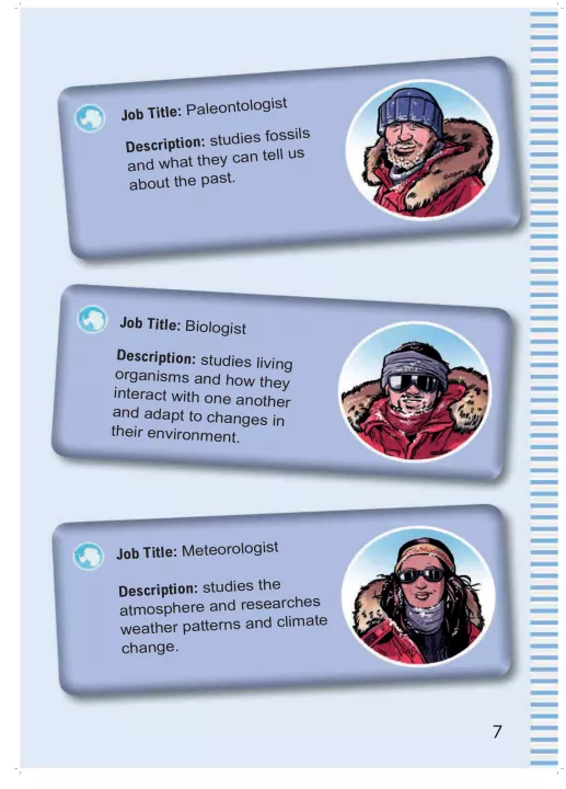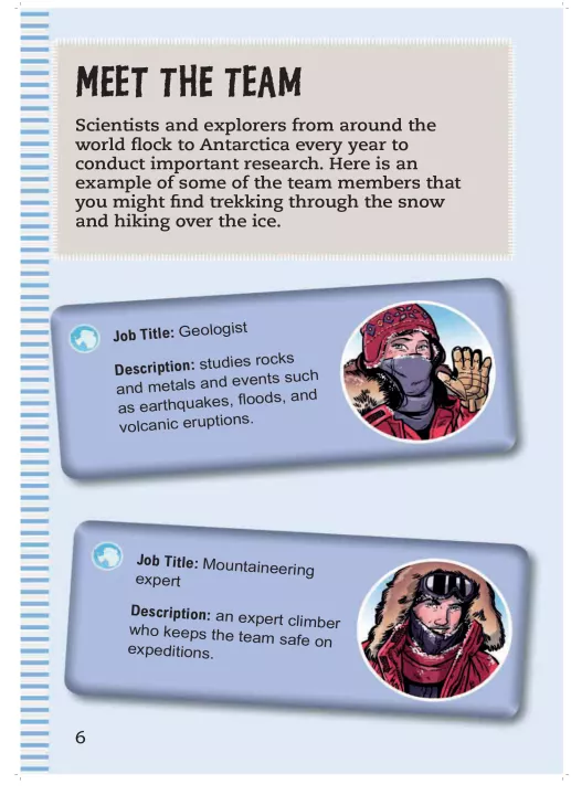 Location -- Meet the team -- Antarctic weather -- The snow sports catalogue -- Ground-to-air signals -- What type of polar explorer are you? -- Base of operations -- Ice-core drilling -- Glaciers and icebergs -- How to build an igloo -- Antarctic ailments -- Famous Antarctic explorers -- Antarctic apparel -- Mawson's diary -- Race to the Pole! Amundsen vs. Scott -- The Midnight Sun -- Ghosts of the Antarctica -- Penguin prisoner lineup -- Poles apart : Finding the South Pole -- Navigation game -- Make your own compass -- Antarctic quiz.;"Discover what it takes to be a scientist on an expedition to Antarctica to drill ice cores for research. Experience the harsh conditions of this polar landscape, learn how to survive, and find out about the intrepid explorers from the past who set out to reach the South Pole"--Page 4 of cover.