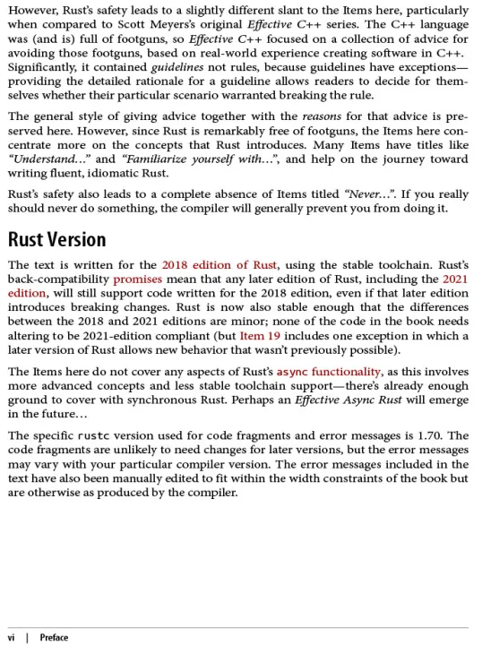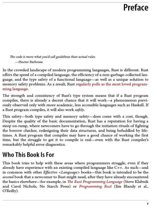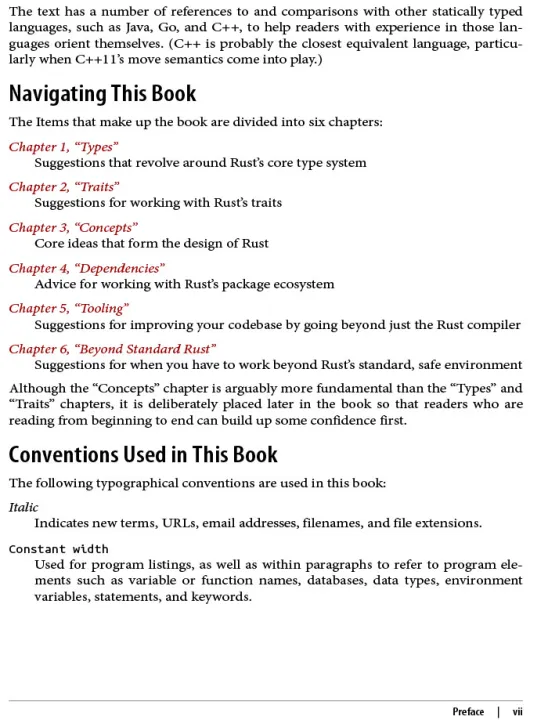 Rust's popularity is growing, due in part to features like memory safety, type safety, and thread safety. But these same elements can also make learning Rust a challenge, even for experienced programmers. This practical guide helps you make the transition to writing idiomatic Rust—while also making full use of Rust's type system, safety guarantees, and burgeoning ecosystem. If you're a software engineer who has experience with an existing compiled language, or if you've struggled to convert a basic understanding of Rust syntax into working programs, this book is for you. By focusing on the conceptual differences between Rust and other compiled languages, and by providing specific recommendations that programmers can easily follow, Effective Rust will soon have you writing fluent Rust, not just badly translated C++. - Understand the structure of Rust's type system- Learn Rust idioms for error handling, iteration, and more- Discover how to work with Rust's crate ecosystem - Use Rust's type system to express your design - Win fights with the borrow checker - Build a robust project that takes full advantage of the Rust tooling ecosystem