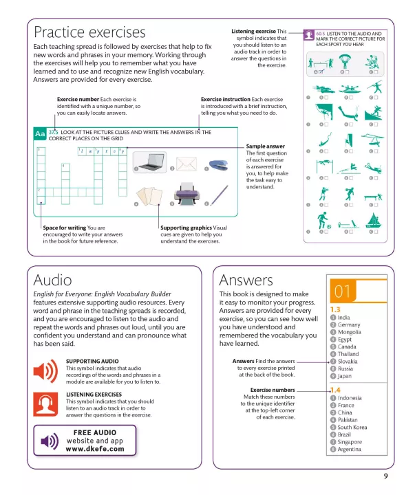 A combined reference book and workbook covering over 3,000 entries of essential words and phrases to expand your English vocabulary. Designed around the most up-to-date theories of language acquisition, English for Everyone: English Vocabulary Builder includes all the words and phrases English learners need to know. Question words, feelings, hairstyles, technology, seasons, entertainment, sports, and more are covered and illustrated, plus paired with audio in the accompanying app available for download. Readers can write their own translations and work through practice exercises to improve their English language skills. Ideal for ESL learners at all stages, from beginner to advanced.