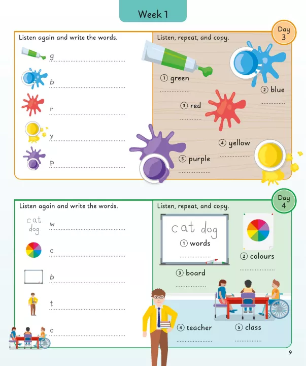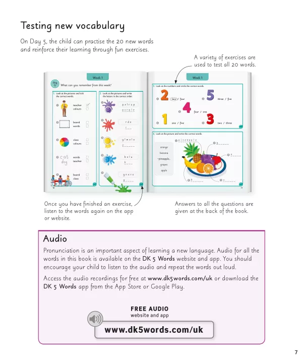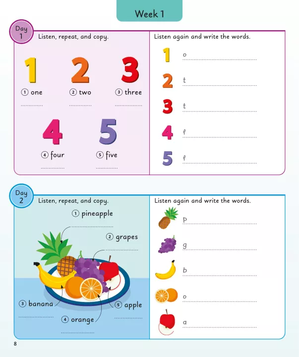 Được đóng gói đầy đủ các từ vựng hữu ích hàng ngày, cuốn sách tham khảo trực quan này sẽ nắm bắt trí tưởng tượng của những người học nhỏ và khuyến khích niềm yêu thích học những từ tiếng Anh đầu tiên của các em. Cuốn sách giới thiệu cho con bạn 5 từ mới để học và luyện tập mỗi ngày trong bốn ngày, sau đó kiểm tra những từ này thông qua nhiều bài tập tương tác vào ngày thứ năm. Trong suốt một năm, con bạn sẽ xây dựng vốn từ vựng hơn 1000 từ tiếng Anh.