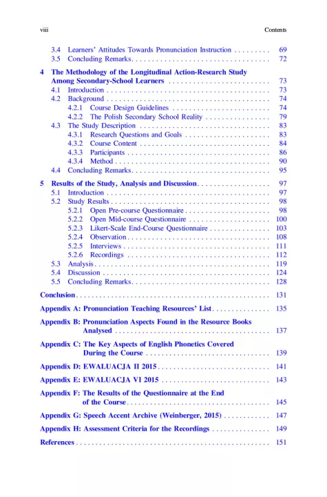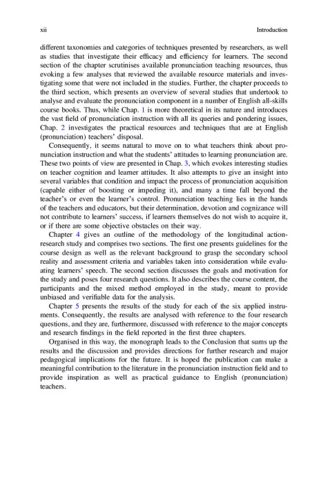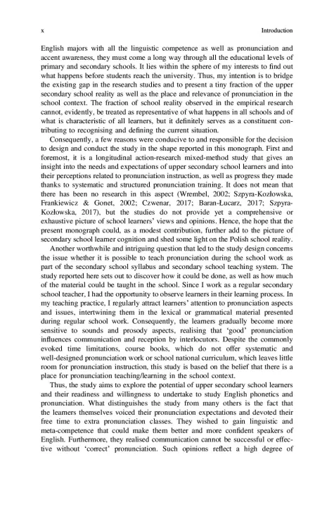 This book provides an overview of pronunciation teaching and learning practices in secondary schools, providing insights into secondary school learners' needs, expectations and motivation regarding the importance of learning English and particularly English pronunciation. It presents a summary of the research on L2 pronunciation acquisition, teaching techniques and factors affecting the learning process as well as the results and conclusions of a longitudinal study conducted in a Polish secondary school. The study indicates that learners consider pronunciation a crucial component of English learning and a predictor of successful communication. Moreover, it shows that accuracy is highly valued by learners, and that systematic and regular pronunciation instruction, even if devoted mainly to segments, has the potential to contribute to the overall improvement in learners' communicative competence and their confidence as speakers and users of English. The book is based on the first-hand experience of a teacher-researcher.