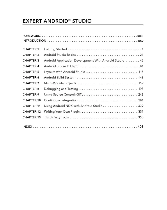Expert Android Studio bridges the gap between your Android programing skills with the provided tools including Android Studio, NDK, Gradle and Plugins for IntelliJ Idea Platform. Packed with best practices and advanced tips and techniques on Android tools, development cycle, continuos integration, release management, testing, and performance, this book offers professional guidance to experienced developers who want to push the boundaries of the Android platform with the developer tools. Youll discover how to use the tools and techniques to unleash your true potential as a developer.