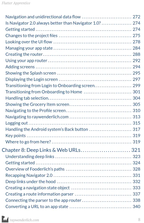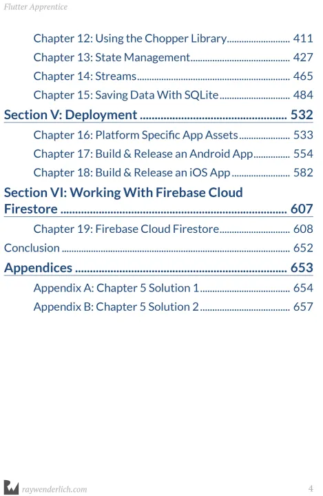 Build for iOS & Android With Flutter! Flutter is an exciting development toolkit that lets you build apps for iOS, Android and even web and desktop, all from a single codebase. It uses a declarative approach to UI development. You can "hot reload" code while developing, and apps will perform at native speed thanks to its custom rendering engine. With Flutter and Flutter Apprentice, you can achieve the dream of building fast applications, faster. Who This Book Is For This book is for developers who are new to Flutter, and also developers that already have some experience with building apps for the iOS and Android platforms, or web apps. Topics Covered in Flutter Apprentice • Widgets: Use Flutter widgets to build modern mobile user interfaces. • Navigation: Navigate between multiple screens within a Flutter app, including using deep links. • Networking and Persistence: Fetch data from the network, parse the JSON response and cache data locally in a SQLite database. • State Management: Explore the all-important idea of state management in Flutter and learn about various state management techniques and tools. • Streams: Learn about Dart streams and how to use them in Flutter apps. • Deployment: Learn to prepare and deploy your app to mobile app stores. • Firebase: Learn how to leverage Firebase Cloud Firestore to store data remotely. One thing you can count on: After reading this book, you’ll be prepared to create and deploy full-featured mobile apps to both the iOS App Store and the Google Play Store, without having to write two separate apps.