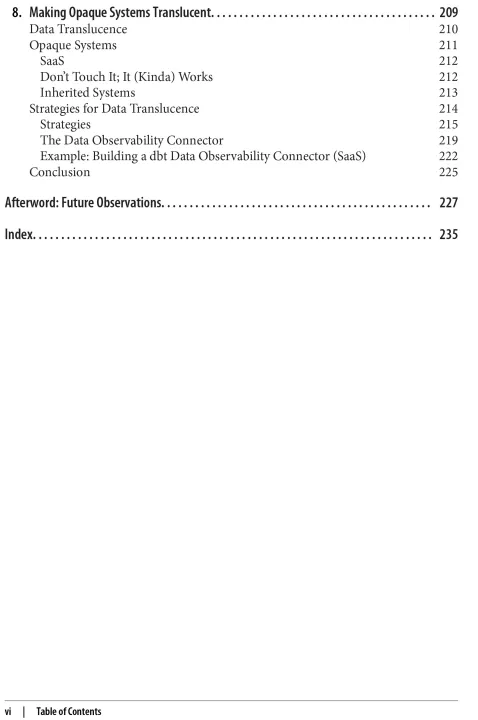 Quickly detect, troubleshoot, and prevent a wide range of data issues through data observability, a set of best practices that enables data teams to gain greater visibility of data and its usage. If you're a data engineer, data architect, or machine learning engineer who depends on the quality of your data, this book shows you how to focus on the practical aspects of introducing data observability in your everyday work.