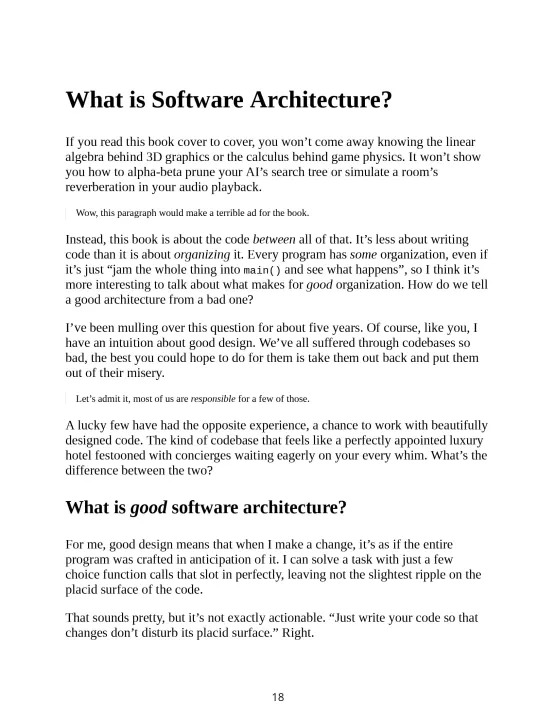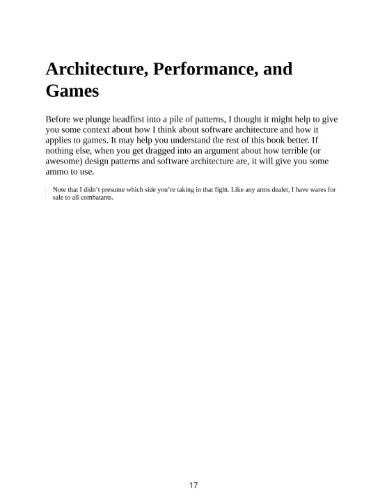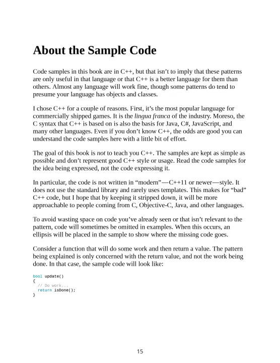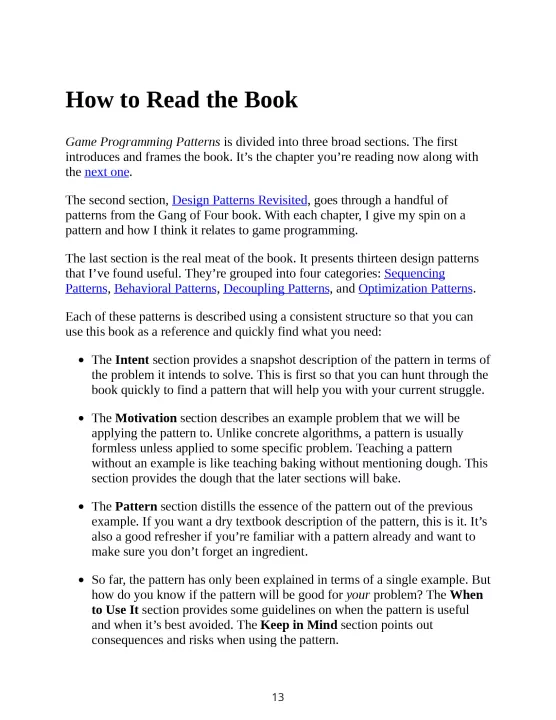 The biggest challenge facing many game programmers is completing their game. Most game projects fizzle out, overwhelmed by the complexity of their own code. Game Programming Patterns tackles that exact problem. Based on years of experience in shipped AAA titles, this book collects proven patterns to untangle and optimize your game, organized as independent recipes so you can pick just the patterns you need. You will learn how to write a robust game loop, how to organize your entities using components, and take advantage of the CPUs cache to improve your performance. You’ll dive deep into how scripting engines encode behavior, how quadtrees and other spatial partitions optimize your engine, and how other classic design patterns can be used in games