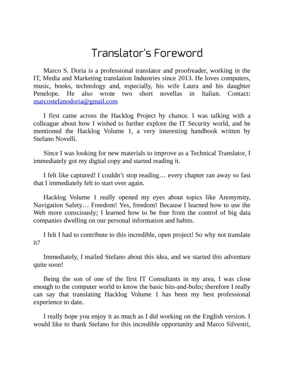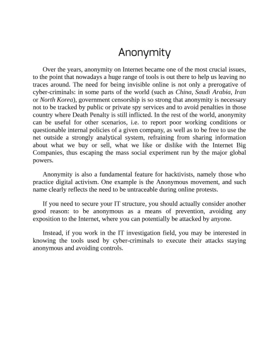 Have you ever wished to become a hacker? If the answer is yes, this book is for you!Started as a crowdfunding project, Hacklog Volume 1: Anonymity is the first of a book collection dedicated to who wants to enter the world of Hacking and IT Security. You’ll learn how to use the tools real-life hackers leverage everyday to avoid controls, how to conceal your most hidden files (and also how to recover them!) and you’ll get a deeper insight over the broad world of anonymity.Hacklog Volume 1: Anonymity was designed for who is not too familiar with IT Security, but is willing to learn! Furthermore, it’s a good review opportunity for those who already know this fascinating world as well as industry experts: High Schools, Universities, Industry Professionals and other Bodies use Hacklog to get information and stay up-to-date about the techniques used by cyber criminals to avoid controls and stay completely anonymous in the broad world of the Web.Here are some of the themes covered by the first volume:* You’ll learn how to use the Operating Systems used by hackers and industry experts, including Ubuntu, Kali Linux, Parrot Security OS and many others, based both on GNU/Linux and Windows and macOS.* You’ll be able to identify the traces left on a computer during an attack or an IT inspection, like MAC Address, Hostnames usage, DNSs and the via-Proxy anonymizing IP* You’ll be able to make secure communications through the VPNs, discovering the best service providers and the regulations about governmental takedowns* You’ll learn the vast world of the Deep Web and the Dark Net, the TOR, I2P and Freenet anonymizing circuits, as well as the Combo Networks to stay safe through pyramidal communication tunnels* You’ll be able to identify the local resources that can harm you, like Cookies, JavaScript, Flash, Java, ActiveX, WebRTC and you will learn how to fingerprint your browser* You’ll learn how to protect your data, verifying it with checksums and encrypting it using techniques like PGP and GPG; furthermore, you will get information about how to encrypt a disk, steganography and how to backup your crucial data* You’ll be able to recover data even after a disk wipe, and destroy it irreversibly, using the same techniques used by the law enforcement bodies around the world* You’ll learn how to identify the vulnerabilities that expose your identity to the Web, and the best practice to prevent it* You’ll learn how to anonymously purchase from the Web, using the Dark Net circuits and crypto-currencies like the BitcoinHacklog, Volume 1: Anonymity is an open project, partially released under Italian Creative Commons 4.0 – Italy.