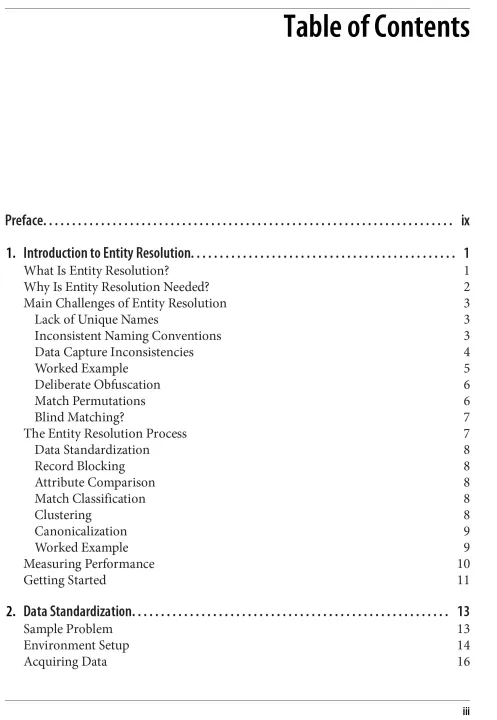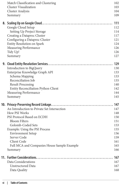 Entity resolution is a key analytic technique that enables you to identify multiple data records that refer to the same real-world entity. With this hands-on guide, product managers, data analysts, and data scientists will learn how to add value to data by cleansing, analyzing, and resolving datasets using open source Python libraries and cloud APIs. Author Michael Shearer shows you how to scale up your data matching processes and improve the accuracy of your reconciliations. You'll be able to remove duplicate entries within a single source and join disparate data sources together when common keys aren't available. Using real-world data examples, this book helps you gain practical understanding to accelerate the delivery of real business value. With entity resolution, you'll build rich and comprehensive data assets that reveal relationships for marketing and risk management purposes, key to harnessing the full potential of ML and AI. This book covers: Challenges in deduplicating and joining datasets Extracting, cleansing, and preparing datasets for matching Text matching algorithms to identify equivalent entities Techniques for deduplicating and joining datasets at scale Matching datasets containing persons and organizations Evaluating data matches Optimizing and tuning data matching algorithms Entity resolution using cloud APIs Matching using privacy-enhancing technologies