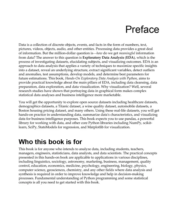 This EDA book is for anyone interested in data analysis, especially students, statisticians, data analysts, and data scientists. The practical concepts presented in this book can be applied in various disciplines to enhance decision-making processes with data analysis and synthesis. Fundamental knowledge of Python programming and statistical concepts is all you need to get started with this book.