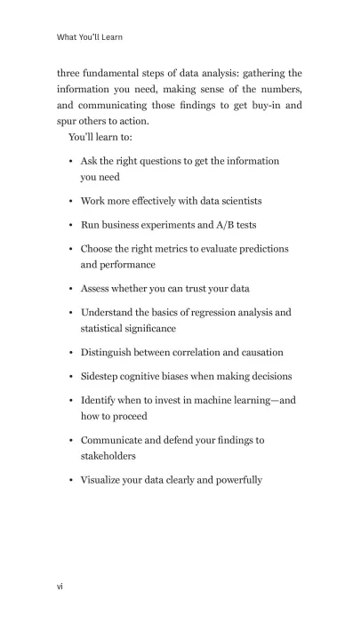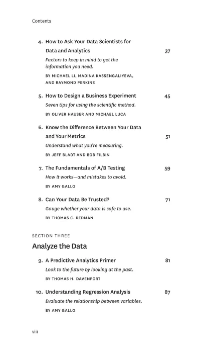Introduction: Why you need to understand data analytics -- Section 1. Getting started: Keep up with your quants: an innumerate's guide to navigating big data / by Thomas H. Davenport -- A simple exercise to help you think like a data scientist: an easy way to learn the process of data analytics / by Thomas C. Redman -- Section 2. Gather the right information: Do you need all that data?: questions to ask for a focused search / by Ron Ashkenas -- How to ask your data scientists for data and analytics: factors to keep in mind to get the information you need / by Michael Li, Madina Kassengaliyeva, and Raymond Perkins -- How to design a business experiment: tips for using the scientific method / by Oliver Hauser and Michael Luca -- Know the difference between your data and your metrics: understand what you're measuring / by Jeff Bladt and Bob Filbin -- The fundamentals of A/B testing: how it works and mistakes to avoid / by Amy Gallo -- Can your data be trusted?: gauge whether your data is safe to use / by Thomas C. Redman -- Section 3. Analyze the data: A predictive analytics primer: look to the future by looking at the past / by Thomas H. Davenport -- Understanding regression analysis: evaluate the relationship between variables / by Amy Gallo -- When to act on a correlation, and when not to: assess your confidence in your findings and the risk of being wrong / by David Ritter -- Can machine learning solve your business problem?: steps to take before investing in AI / by Anastassia Fedyk -- A refresher on statistical significance: check if your results are real or just luck / by Amy Gallo -- Linear thinking in a nonlinear world: a common mistake that leads to errors in judgment / by Bart de Langhe, Stefano Puntoni, and Richard Larrick -- Pitfalls of data-driven decisions: the cognitive traps to avoid / by Megan MacGarvie and Kristina McElheran -- Don't let your analytics cheat the truth: always ask for the outliers / by Michael Schrage -- Section 4. Communicate your findings: Data is worthless if you don't communicate it: tell people what it means / by Thomas H. Davenport -- When data visualization works, and when it doesn't: not all data is worth the effort / by Jim Stikeleather -- How to make charts that pop and persuade: questions to help give your numbers meaning / by Nancy Duarte -- Why it's so hard for us to communicate uncertainty: illustrating - and understanding - the likelihood of events: an interview with Scott Berinato / by Nicole Torres -- Responding to someone who angrily challenges your data: ensure the data is thorough, then make them an ally / by Jon M. Jachimowicz -- Decisions don't start with data: influence others through story and emotion / by Nick Morgan