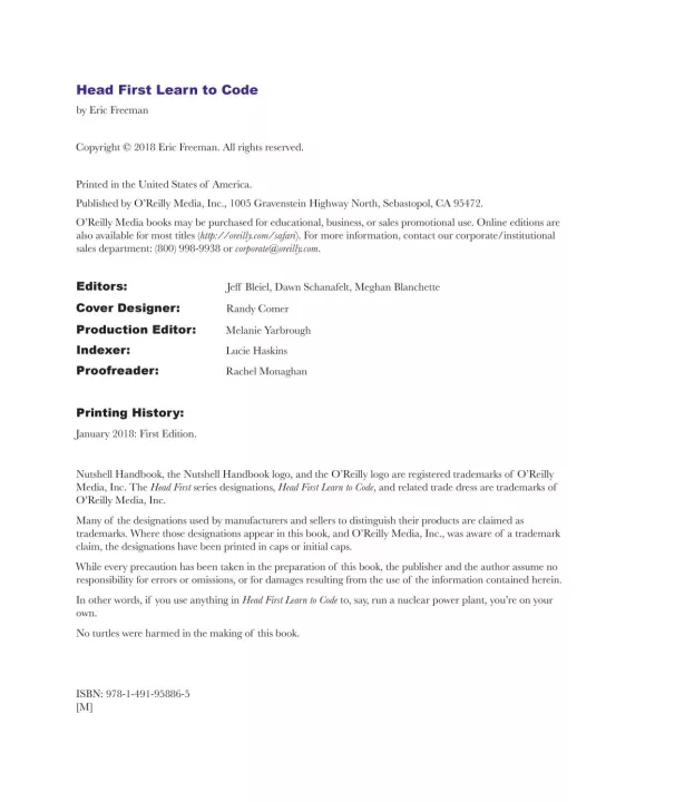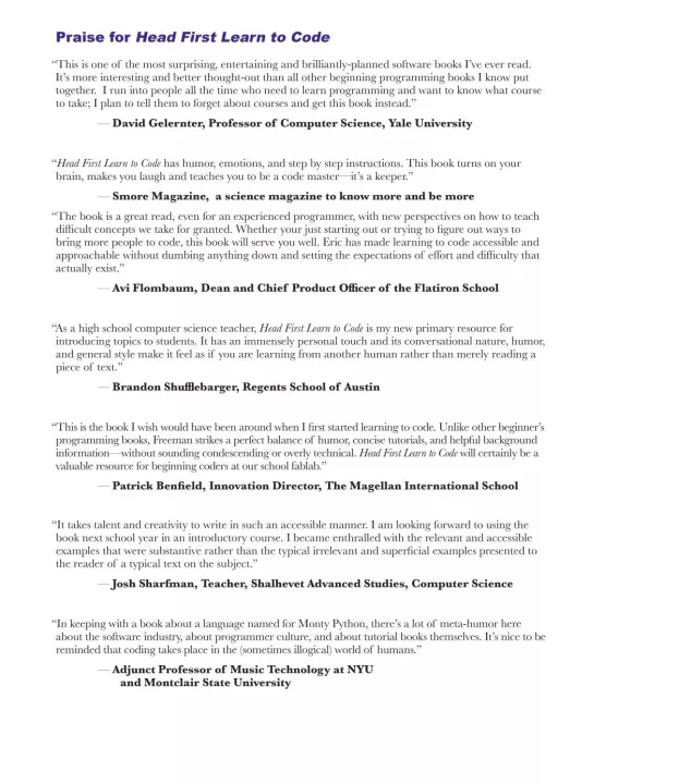 Based on the latest research in cognitive science and learning theory, Head First Learn to Code uses a visually rich format to engage your mind, rather than a text-heavy approach that puts you to sleep. Why waste your time struggling with new concepts? This multi-sensory learning experience is designed for the way your brain really works.