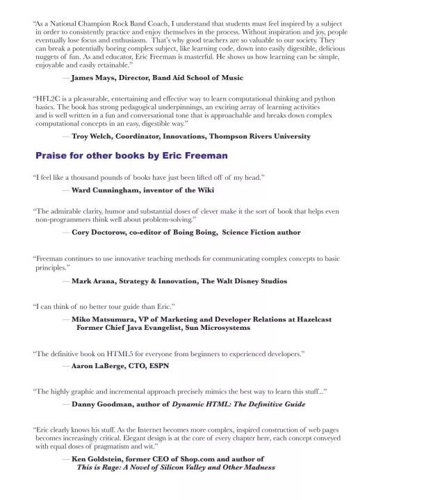 It’s no secret the world around you is becoming more connected, more configurable, more programmable, more computational. You can remain a passive participant, or you can learn to code. With Head First Learn to Code you’ll learn how to think computationally and how to write code to make your computer, mobile device, or anything with a CPU do things for you. Using the Python programming language, you’ll learn step by step the core concepts of programming as well as many fundamental topics from computer science, such as data structures, storage, abstraction, recursion, and modularity.