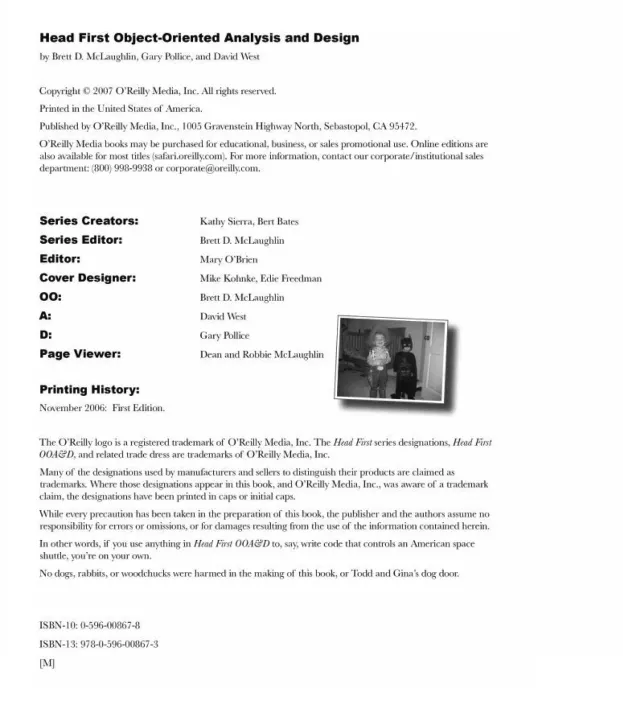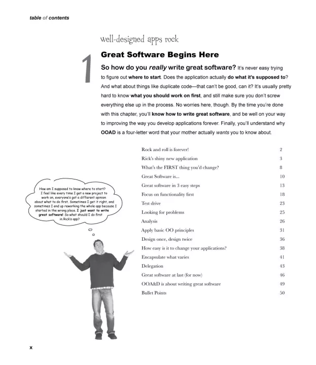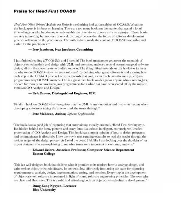 Head First Object-Oriented Analysis & Design shows you how to analyze, design, and write serious object-oriented software: software that's easy to reuse, maintain, and extend; software that doesn't hurt your head; software that lets you add new features without breaking the old ones. Inside you will learn how to: * Use OO principles like encapsulation and delegation to build applications that are flexible * Apply the Open-Closed Principle (OCP) and the Single Responsibility Principle (SRP) to promote reuse of your code * Leverage the power of design patterns to solve your problems more efficiently * Use UML, use cases, and diagrams to ensure that all stakeholders are communicating clearly to help you deliver the right software that meets everyone's needs.
