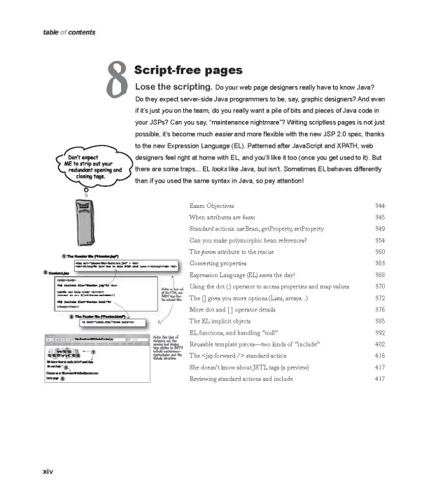 Looking to study up for the new J2EE 1.5 Sun Certified Web Component Developer (SCWCD) exam? This book will get you way up to speed on the technology you'll know it so well, in fact, that you can pass the brand new J2EE 1.5 exam. If that's what you want to do, that is. Maybe you don't care about the exam, but need to use servlets and JSPs in your next project. You're working on a deadline. You're over the legal limit for caffeine. You can't waste your time with a book that makes sense only AFTER you're an expert (or worse, one that puts you to sleep). Learn how to write servlets and JSPs, what makes a web container tick (and what ticks it off), how to use JSP's Expression Language (EL for short), and how to write deployment descriptors for your web applications. Master the c:out tag, and get a handle on exactly what's changed since the older J2EE 1.4 exam. You don't just pass the new J2EE 1.5 SCWCD exam, you'll understand this stuff and put it to work immediately. Head First Servlets and JSP doesn't just give you a bunch of facts to memorize; it drives knowledge straight into your brain. You'll interact with servlets and JSPs in ways that help you learn quickly and deeply. And when you're through with the book, you can take a brand-new mock exam, created specifically to simulate the real test-taking experience.