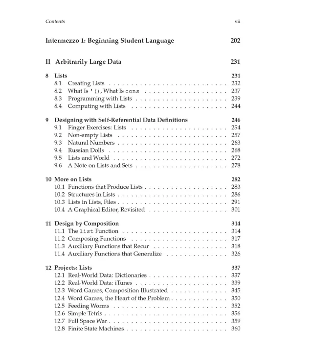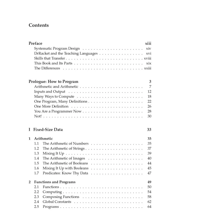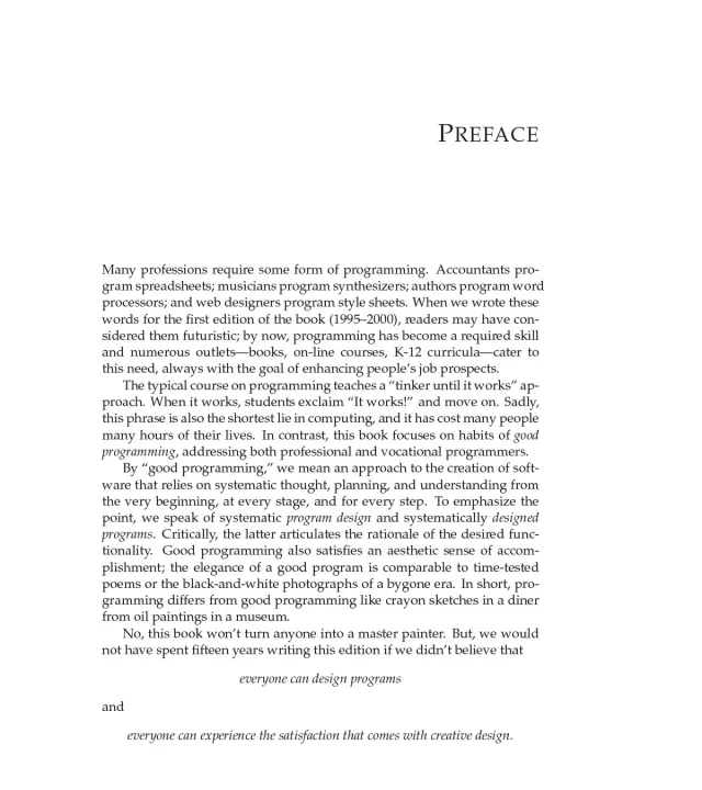 This introduction to programming places computer science at the core of a liberal arts education. Unlike other introductory books, it focuses on the program design process, presenting program design guidelines that show the reader how to analyze a problem statement, how to formulate concise goals, how to make up examples, how to develop an outline of the solution, how to finish the program, and how to test it. Because learning to design programs is about the study of principles and the acquisition of transferable skills, the text does not use an off-the-shelf industrial language but presents a tailor-made teaching language. For the same reason, it offers DrRacket, a programming environment for novices that supports playful, feedback-oriented learning. The environment grows with readers as they master the material in the book until it supports a full-fledged language for the whole spectrum of programming tasks.