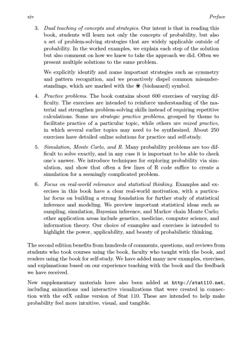 The book includes many intuitive explanations, diagrams, and practice problems. Each chapter ends with a section showing how to perform relevant simulations and calculations in R, a free statistical software environment.