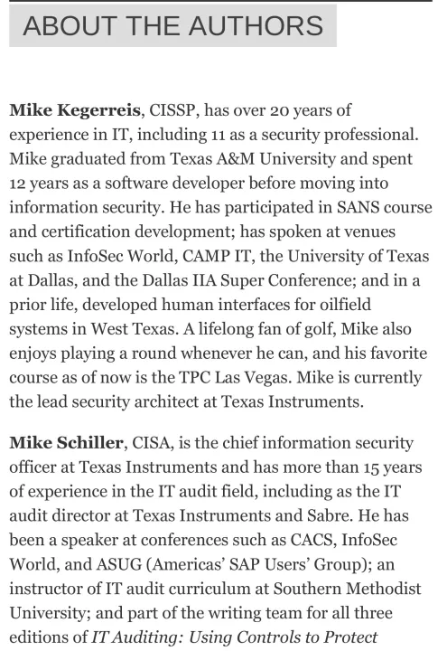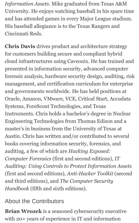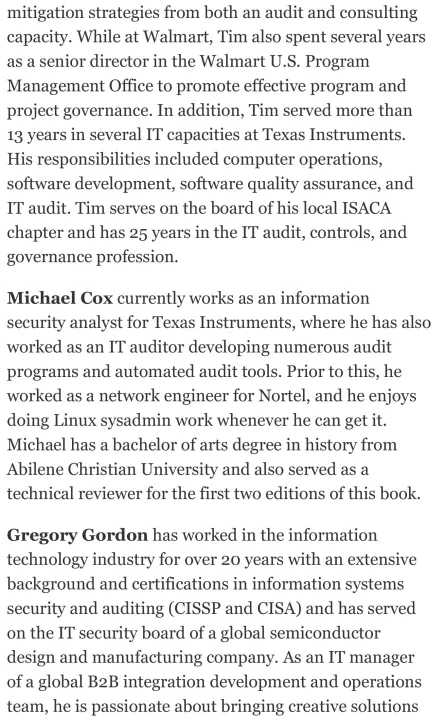 Secure Your Systems Using the Latest IT Auditing Techniques Fully updated to cover leading-edge tools and technologies, IT Auditing: Using Controls to Protect Information Assets, Third Edition, explains, step by step, how to implement a successful, enterprise-wide IT audit program. New chapters on auditing cybersecurity programs, big data and data repositories, and new technologies are included. This comprehensive guide describes how to assemble an effective IT audit team and maximize the value of the IT audit function. In-depth details on performing specific audits are accompanied by real-world examples, ready-to-use checklists, and valuable templates. Standards, frameworks, regulations, and risk management techniques are also covered in this definitive resource. • Build and maintain an internal IT audit function with maximum effectiveness and value • Audit entity-level controls and cybersecurity programs • Assess data centers and disaster recovery • Examine switches, routers, and firewalls • Evaluate Windows, UNIX, and Linux operating systems • Audit Web servers and applications • Analyze databases and storage solutions • Review big data and data repositories • Assess end user computer devices, including PCs and mobile devices • Audit virtualized environments • Evaluate risks associated with cloud computing and outsourced operations • Drill down into applications and projects to find potential control weaknesses • Learn best practices for auditing new technologies • Use standards and frameworks, such as COBIT, ITIL, and ISO • Understand regulations, including Sarbanes-Oxley, HIPAA, and PCI • Implement proven risk management practices
