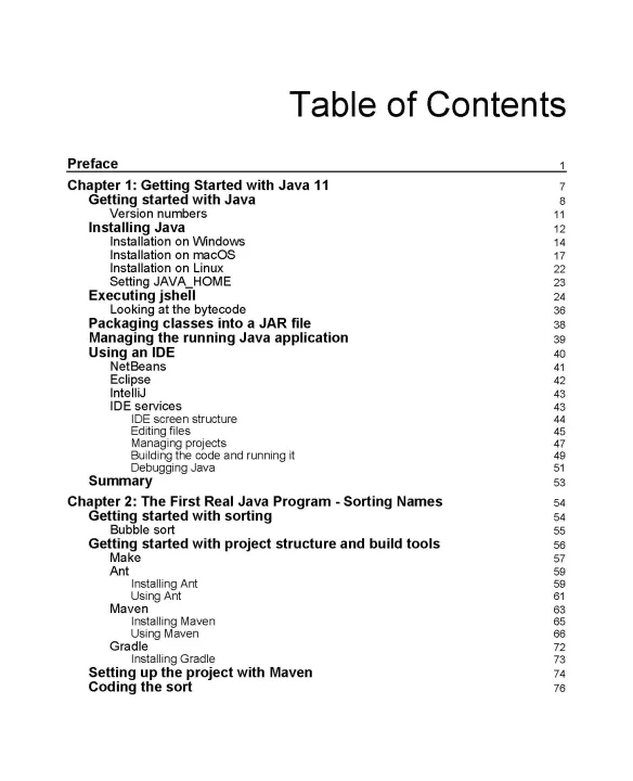 Java is one of the most commonly used software languages by programmers and developers. In this book, you’ll learn the new features of Java 11 quickly and experience a simple and powerful approach to software development. You’ll see how to use the Java runtime tools, understand the Java environment, and create a simple namesorting Java application. Further on, you'll learn about advanced technologies that Java delivers, such as web programming and parallel computing, and will develop a mastermind game. Moving on, we provide more simple examples, to build a foundation before diving into some complex data structure problems that will solidify your Java 11 skills. With a special focus on the features of new projects: Project Valhalla, Project Panama, Project Amber, and Project Loom, this book will help you get employed as a top-notch Java developer. By the end of the book, you’ll have a firm foundation to continue your journey toward becoming a professional Java developer.