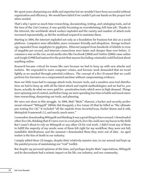 An amazing community has built up around Kali Linux. Every month, more than 300,000 of us download a version of Kali. We come together in online and real-world training rooms and grind through the sprawling Offensive Security Penetration Testing Labs, pursuing the near-legendary Offensive Security certifications. We come together on the Kali forums, some 40,000 strong, and hundreds of us at a time can be found on the Kali IRC channel. We gather at conferences and attend Kali Dojos to learn from the developers themselves how to best leverage Kali.