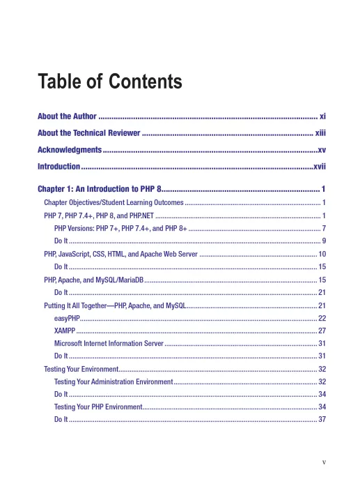 In Learn PHP 8, programming examples take advantage of the newest PHP features; you’ll follow a learn-by-doing approach, which provides you with complete coding examples. “Do It” exercises in each chapter provide the opportunity to make adjustments to the example code. The end-of-chapter programming exercises allow you to develop your own applications using the algorithms demonstrated in the chapter.