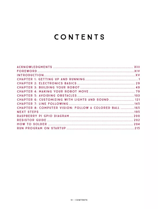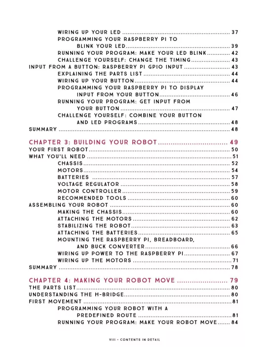 As you work through the book, you'll learn fundamental electronics skills like how to wire up parts, use resistors and regulators, and determine how much power your robot needs. By the end, you'll have learned the basics of coding in Python and know enough about working with hardware like LEDs, motors, and sensors to expand your creations beyond simple robots.