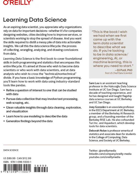 Learning Data Science is the first book to cover foundational skills in both programming and statistics that encompass this entire lifecycle. It's aimed at those who wish to become data scientists or who already work with data scientists, and at data analysts who wish to cross the "technical/nontechnical" divide. If you have a basic knowledge of Python programming, you'll learn how to work with data using industry-standard tools like pandas.